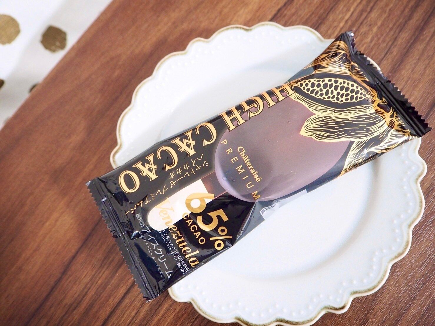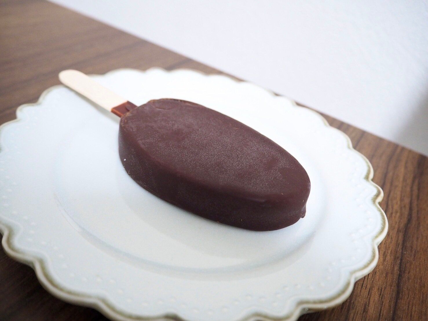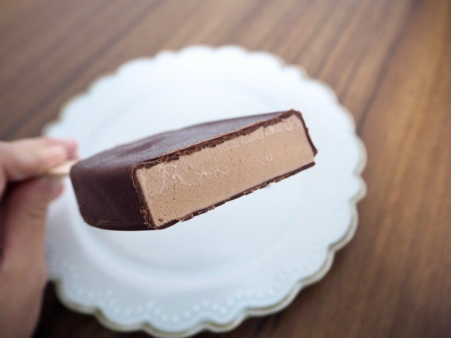 アイス部分とチョココーティングを同時に食べると、最初には甘さがきますが後味にカカオのこうばしい香りがくちいっぱいに残ります。