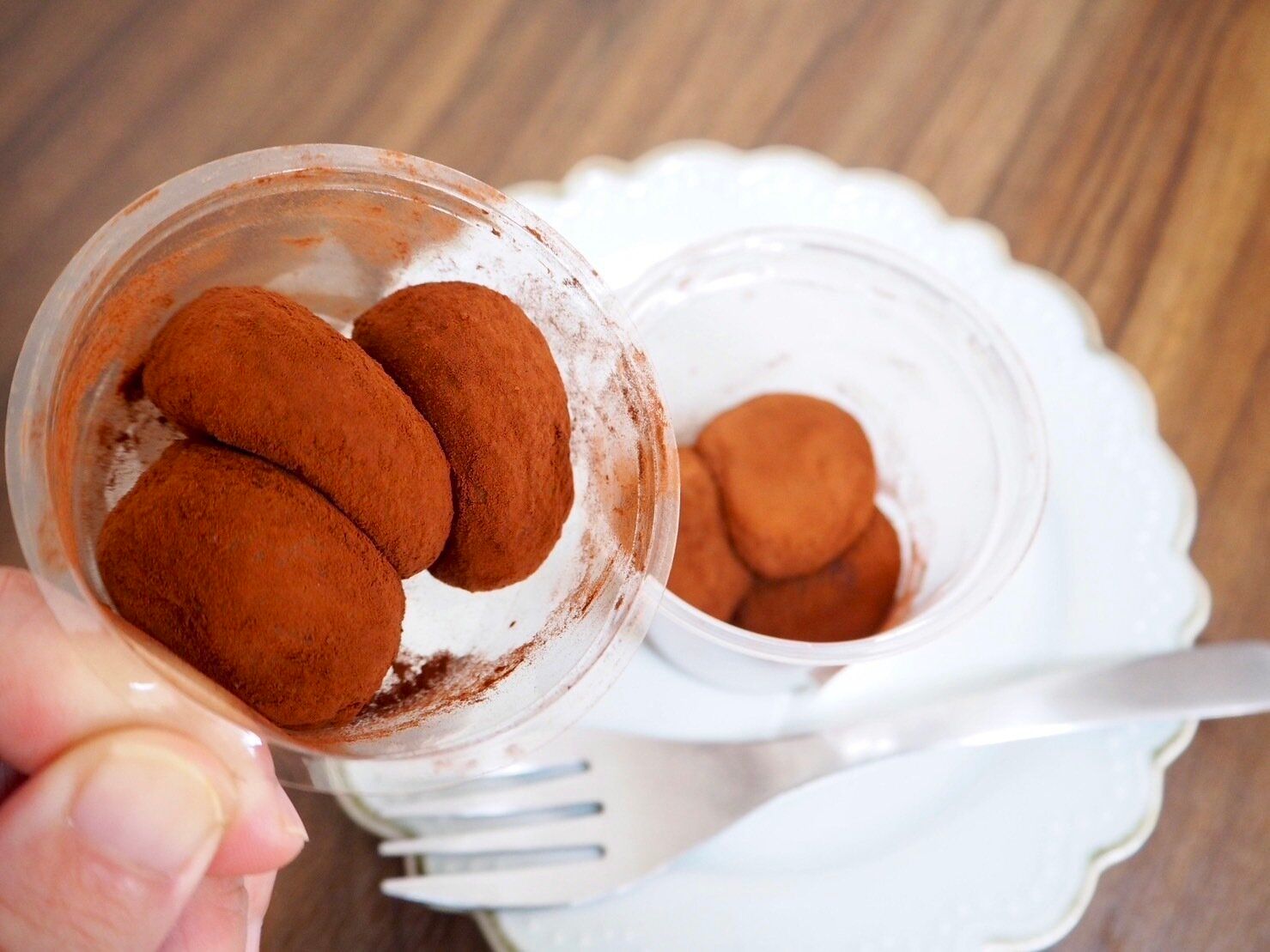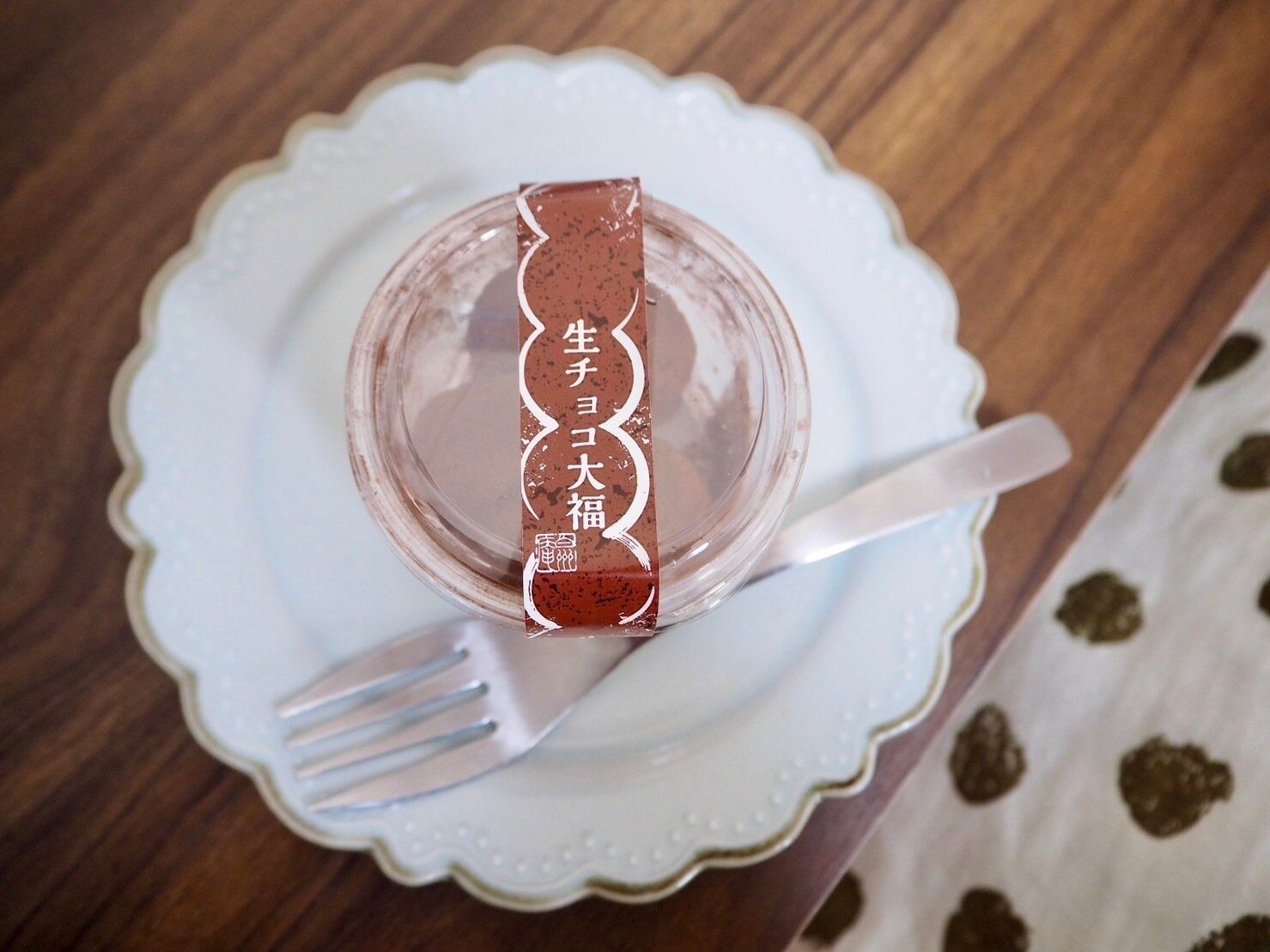 大福生地に生チョコレート包み、さらにココアパウダーをまぶしたカップ入りの大福です。