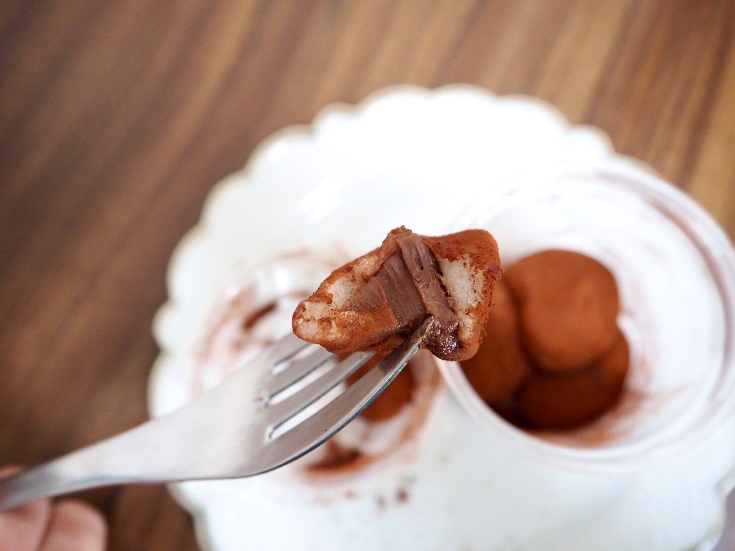 ココアパウダーはこぼれるほどたっぷりとかかっているので、お皿や机の上にパウダーまみれに!