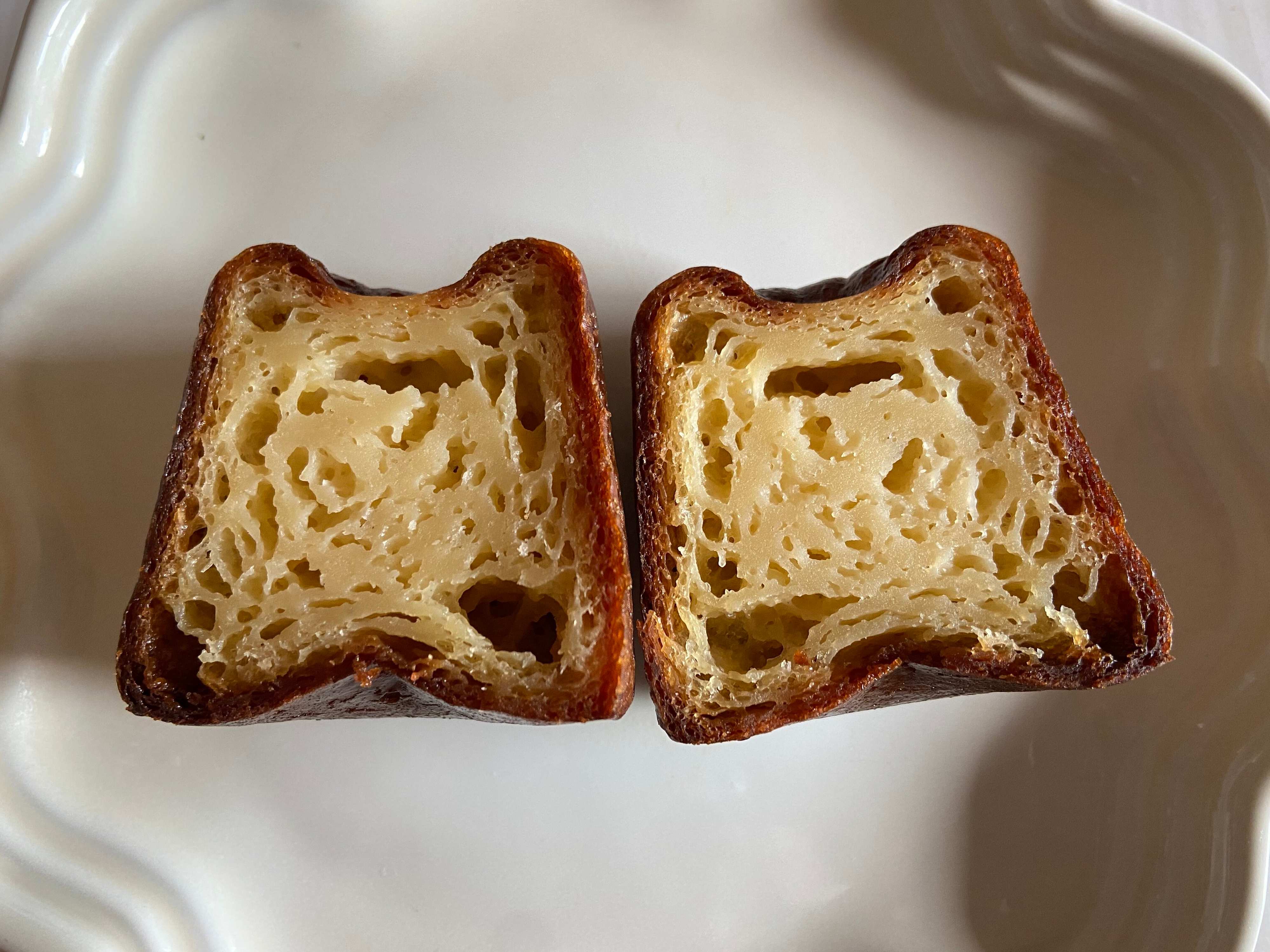 温めたカヌレを食べてみると周りはカリッと、中はもっちりとしてやみつきになる食感。周りの焦げたカラメルのようなコクのある甘みと風味、たまご感たっぷりのもっちりした中の生地の味わいが絶妙にマッチしています。