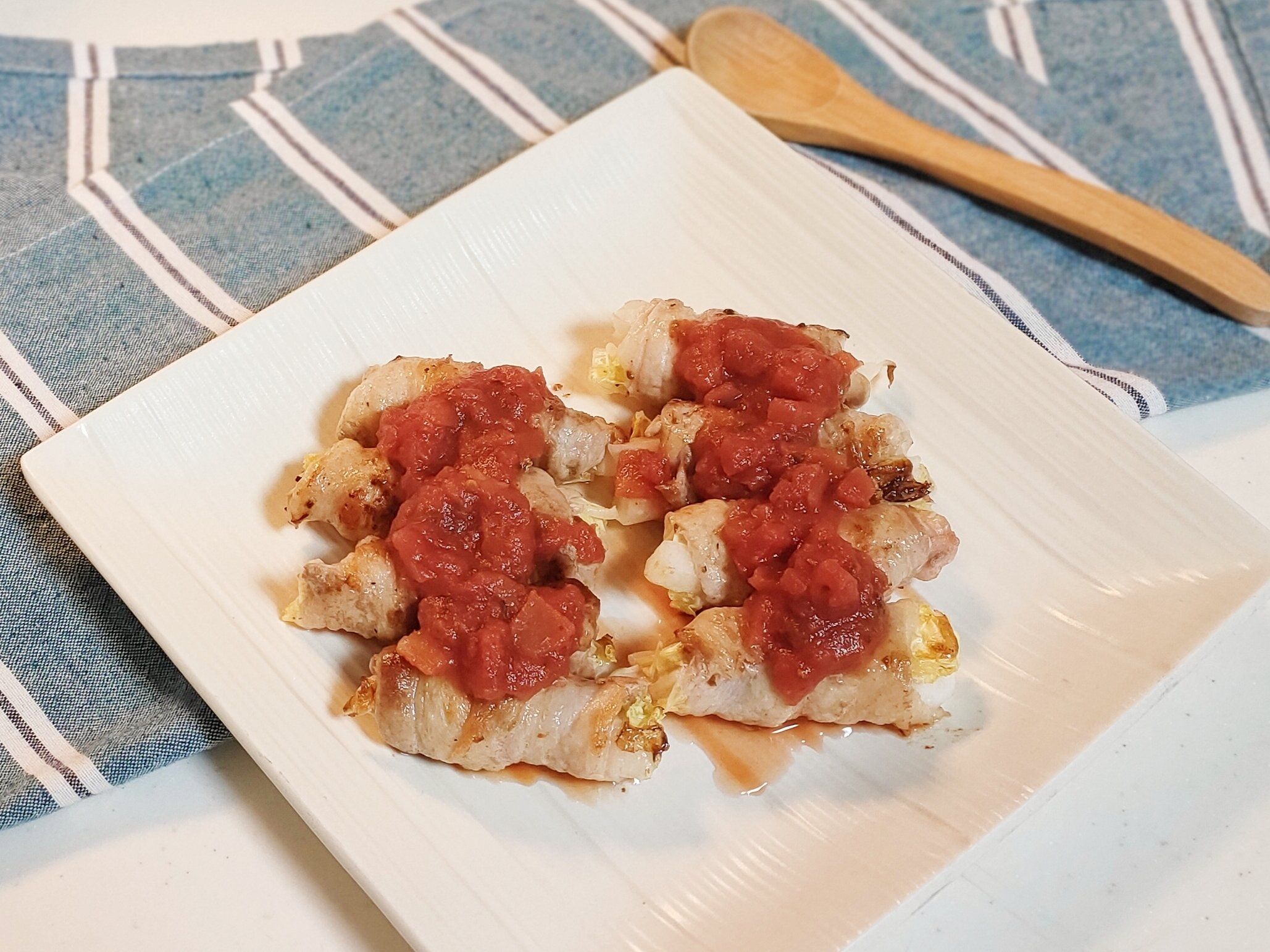 1、白菜を長方形にカットして、豚肉に白菜をのせて巻く