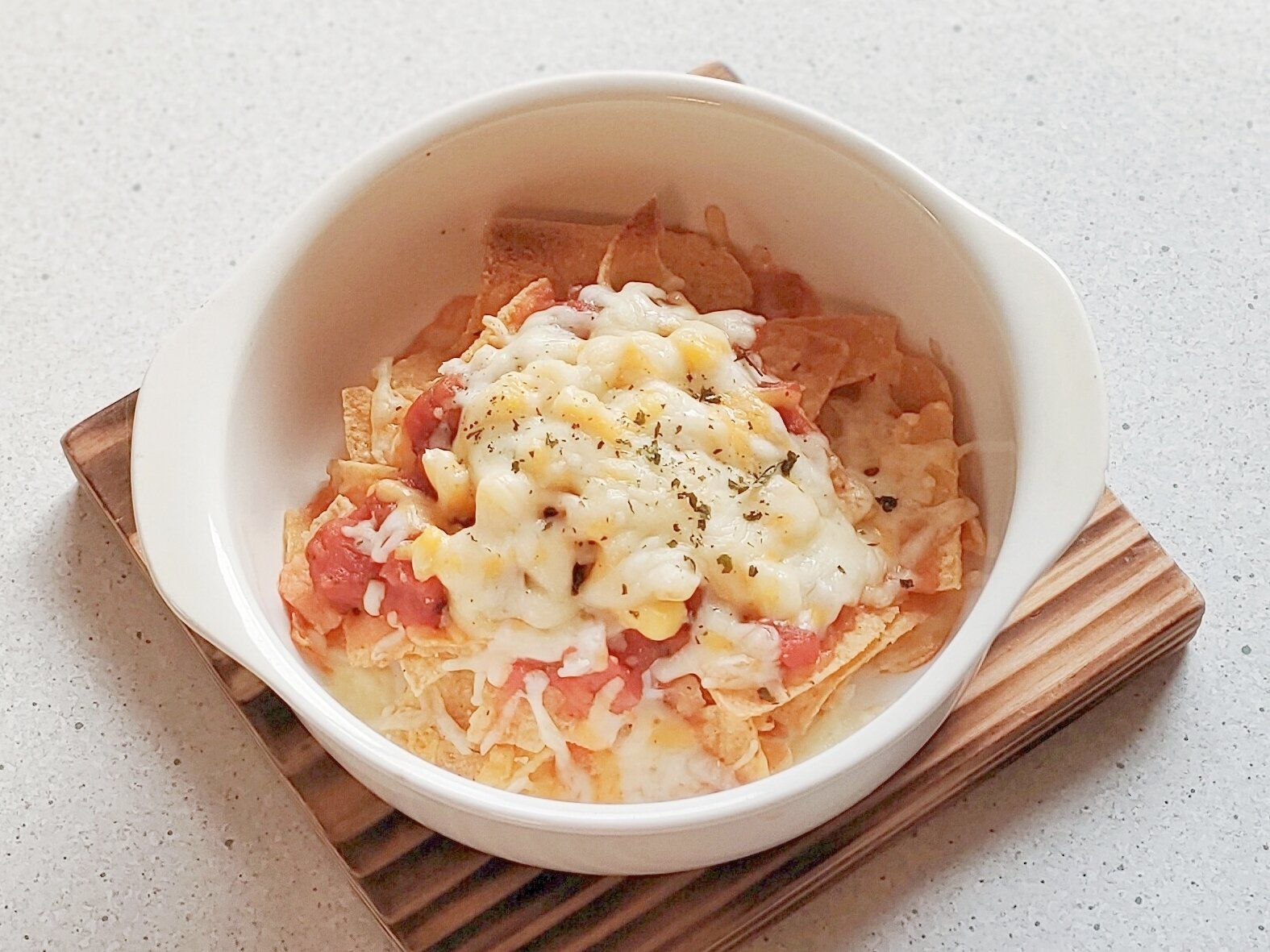お好みでコーンやツナをトッピングしてもOK!とろっとしたチーズとぴりっとしたサルサソースがチップスにぴったりで、簡単なのに本格的なメキシコ料理が作れます。