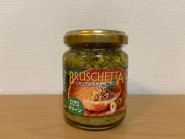 ザク切りオリーブがたっぷりオイル漬けになった、カルディで人気の瓶入り調味料「ブルスケッタザク切りオリーブグリーン」。シリーズにはザク切りのブラックオリーブもあります。