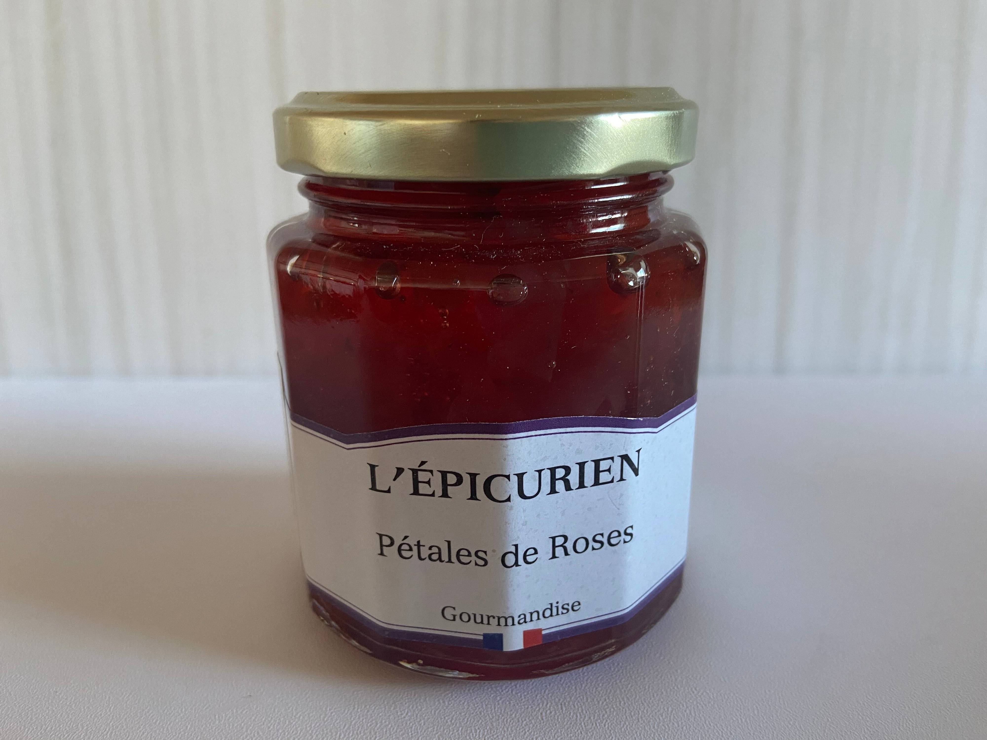 フランス産のバラの花びら入りの香り高いおしゃれなスプレッド、「レピキュリアンコンフィチュールローズペタル」。スプーンですくってみるとゆるめのとろっとした質感で、とにかく香りが華やか。