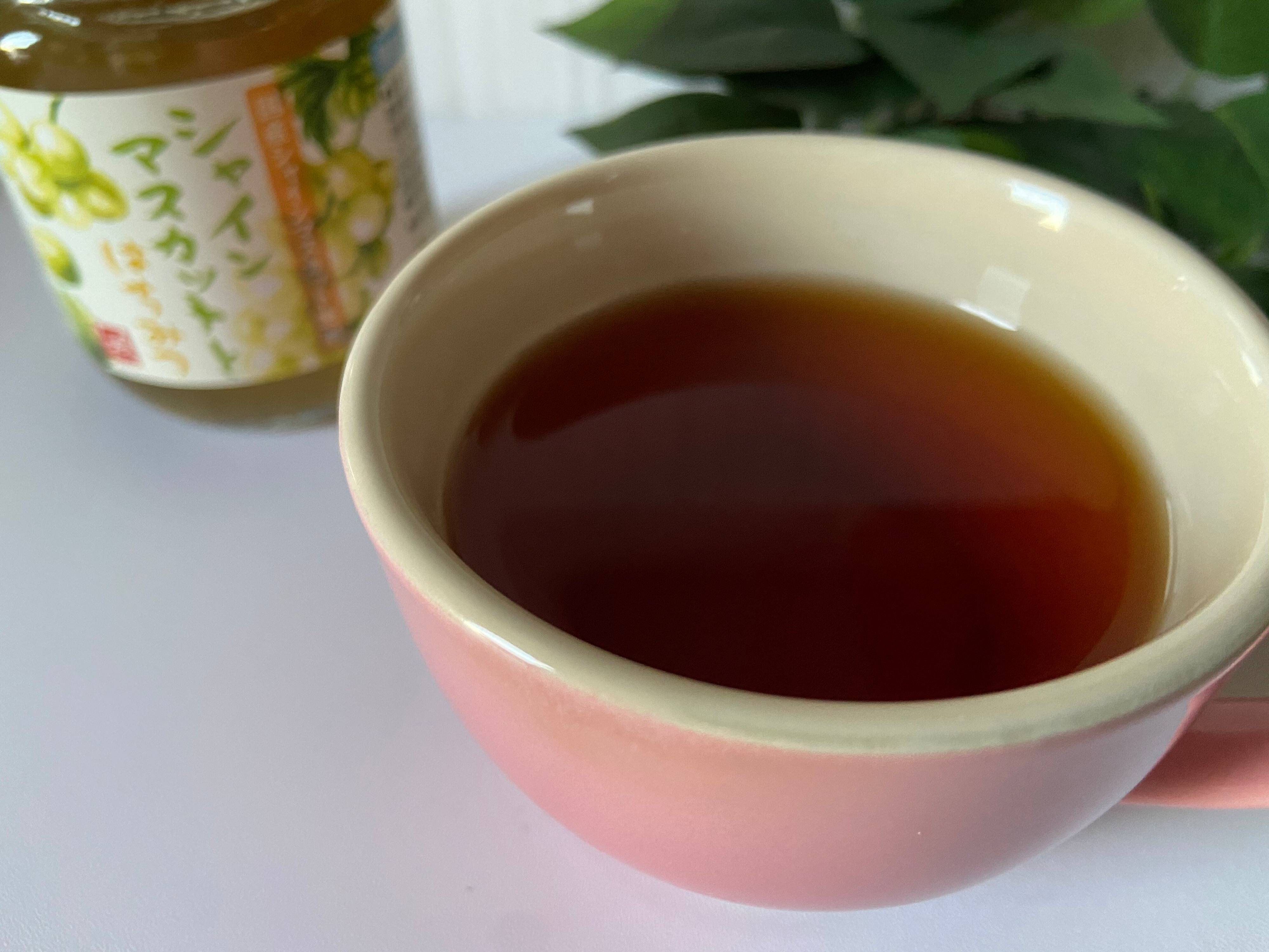 紅茶と相性がいいのがカルディのはちみつスプレッドシリーズ。今回は温かい紅茶に「シャインマスカットとはちみつ」をティースプーン1杯加えました。