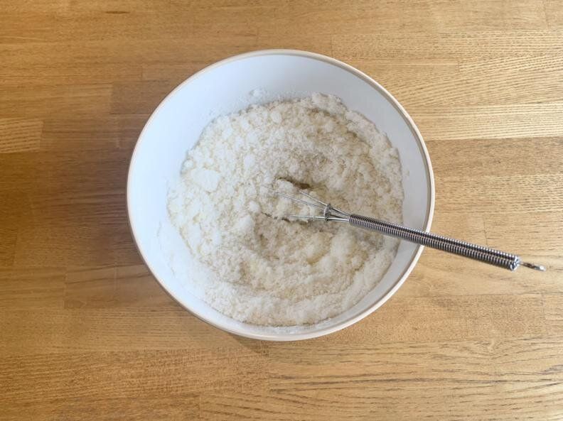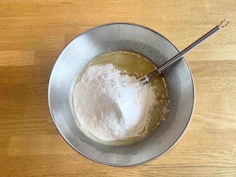 【2】米油を加えて混ぜ、米粉とベーキングパウダーを加えて混ぜ合わせます。