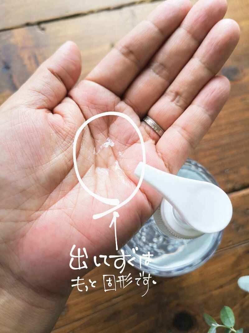 使用感は携帯タイプと変わりませんが、少し固めのジェル感があり、手の温度でス~っとさらりとした液体になるのも特徴です。香りはまったくなく、携帯タイプと同様に、アルコール特有の香りも感じません。