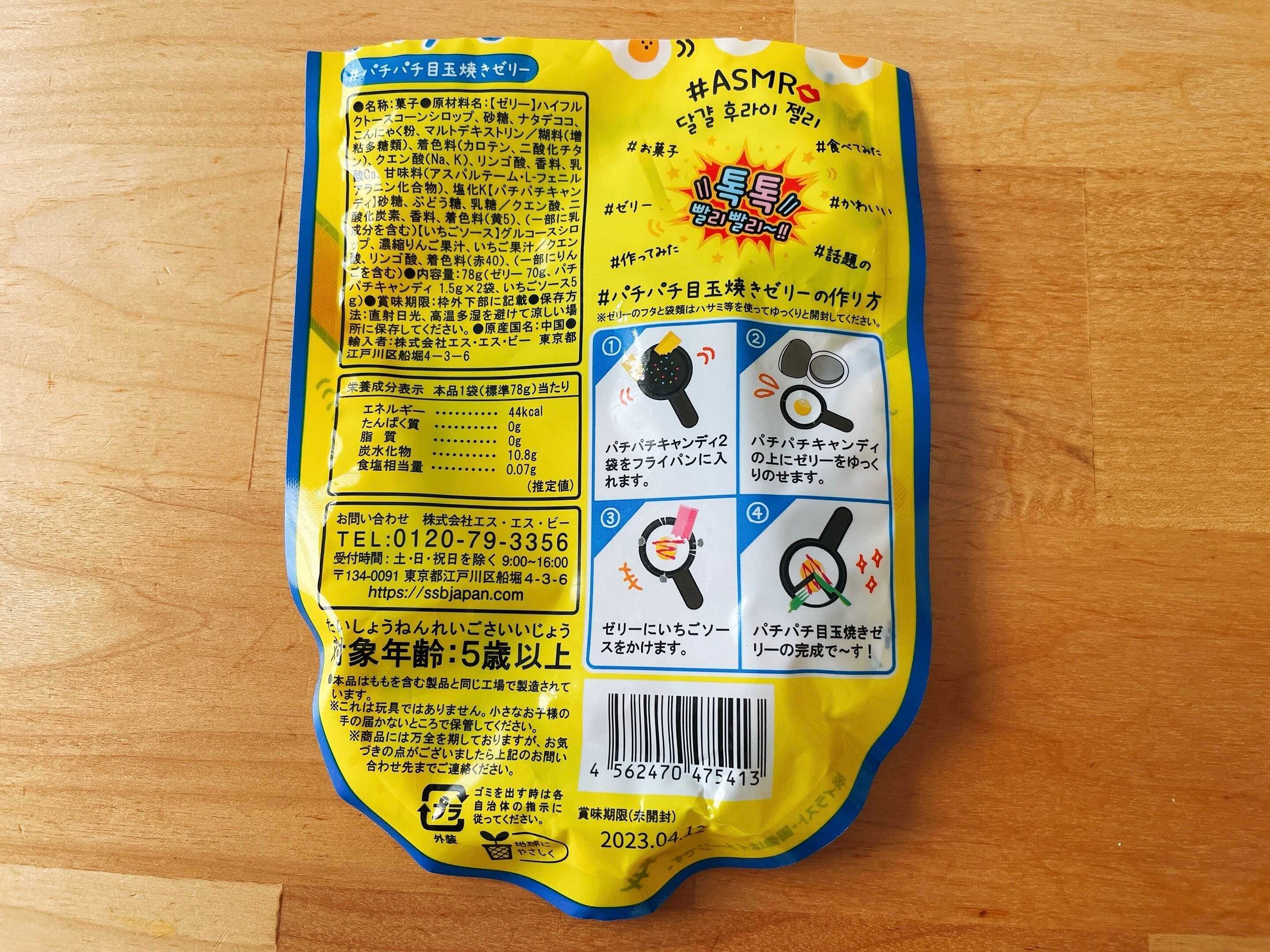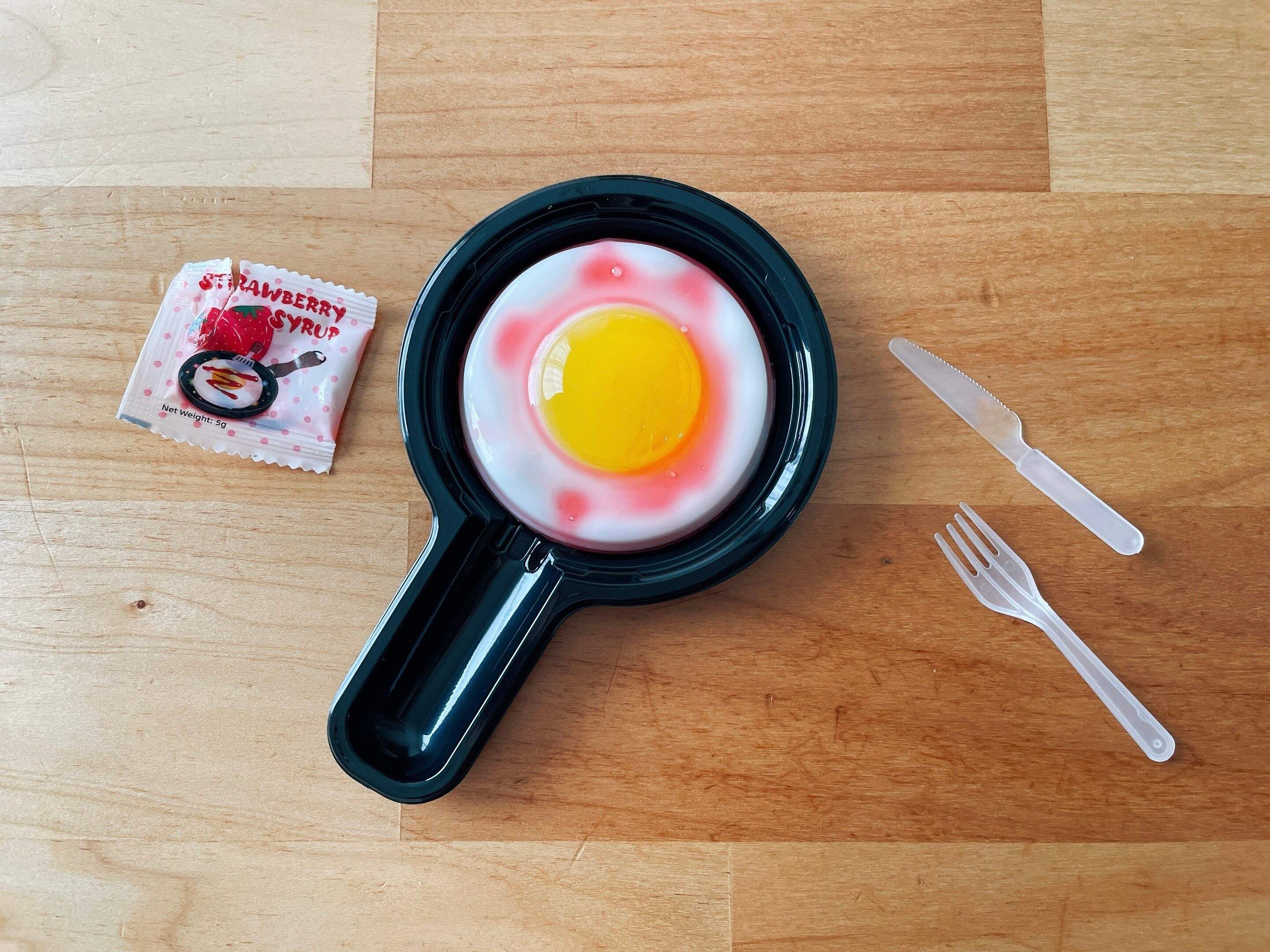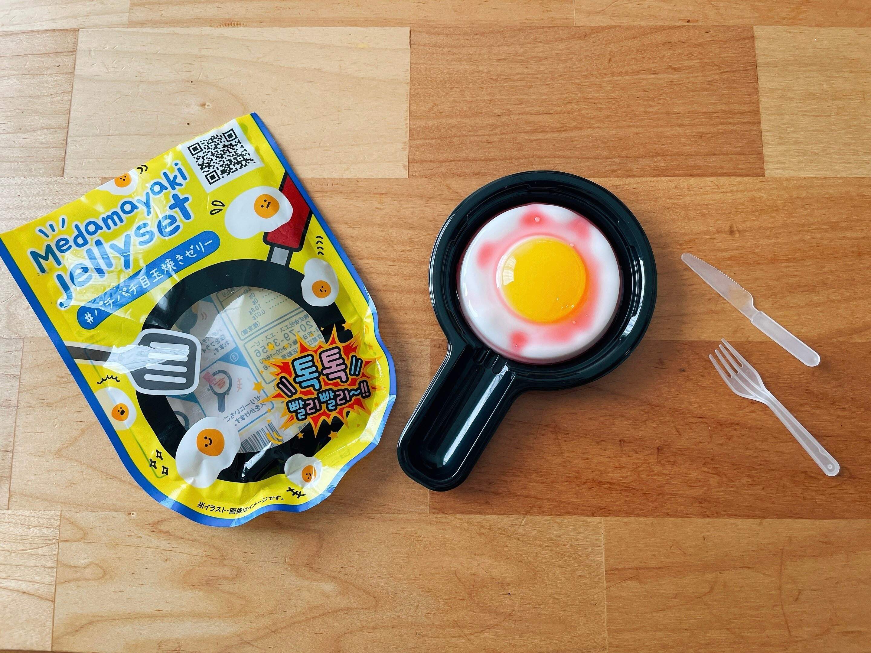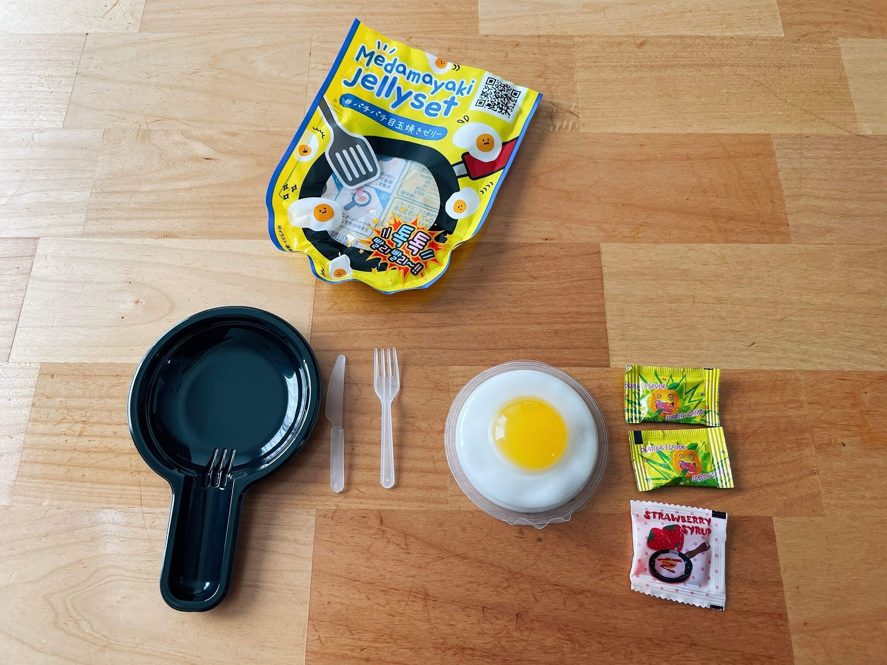 パッケージを開けてみると、フライパンの形をしたトレー、目玉焼きの形をしたゼリー、パチパチキャンディ2袋、ストロベリーソース、小さいナイフとフォークが出てきました。