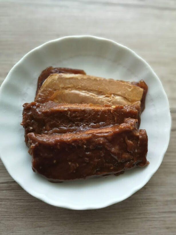 甘辛い味噌ベースの味つけで、豚のばら肉を柔らかく煮込んであり、角煮やチャーシューとはまた違った味わいを楽しめる一品です。