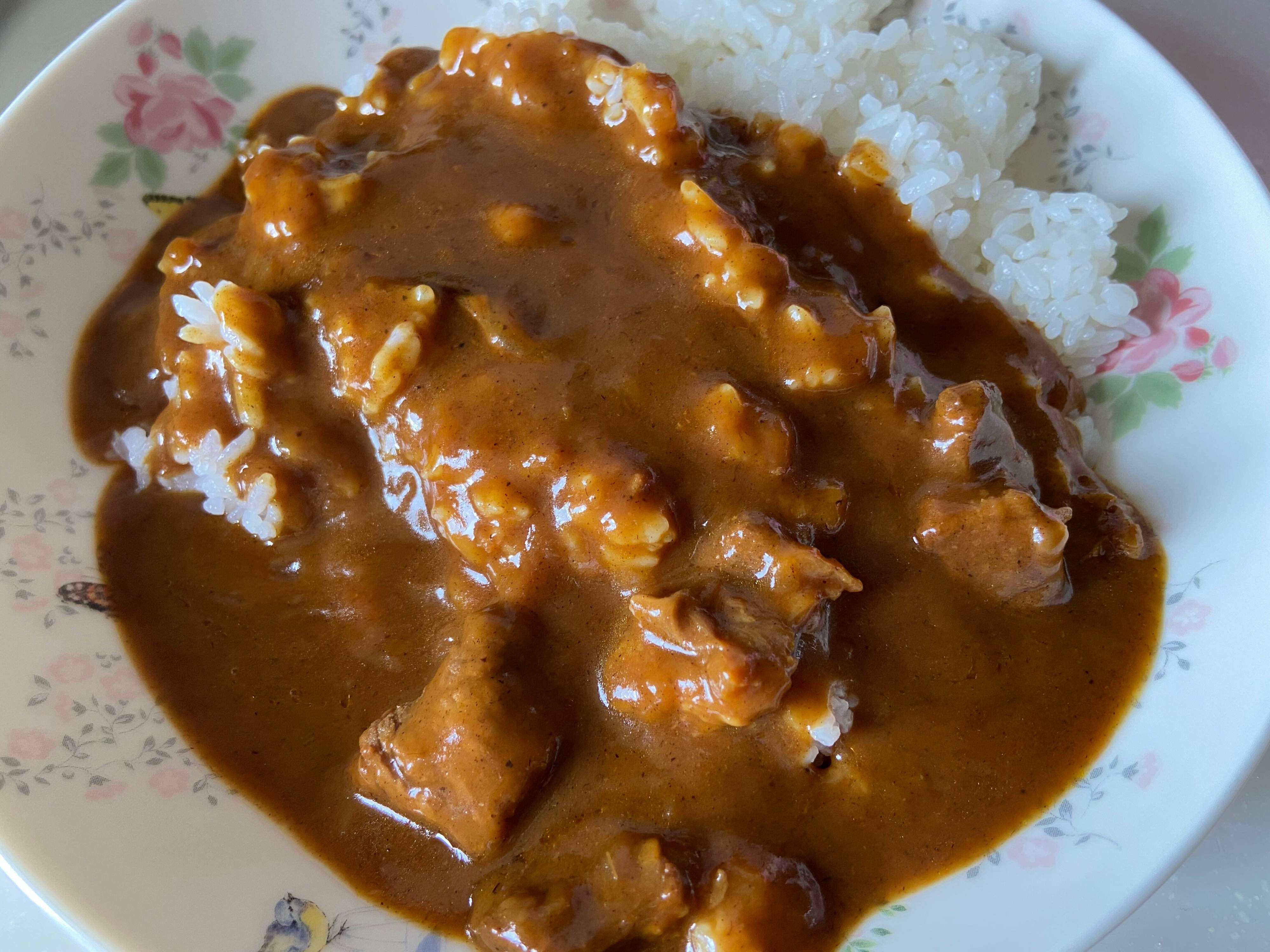 温めたカレーをご飯にかけました。お肉がたっぷり入っているのがわかります。辛さは5段階中3で、辛いものがそんなに得意ではない筆者でもおいしく食べられる中辛レベル。