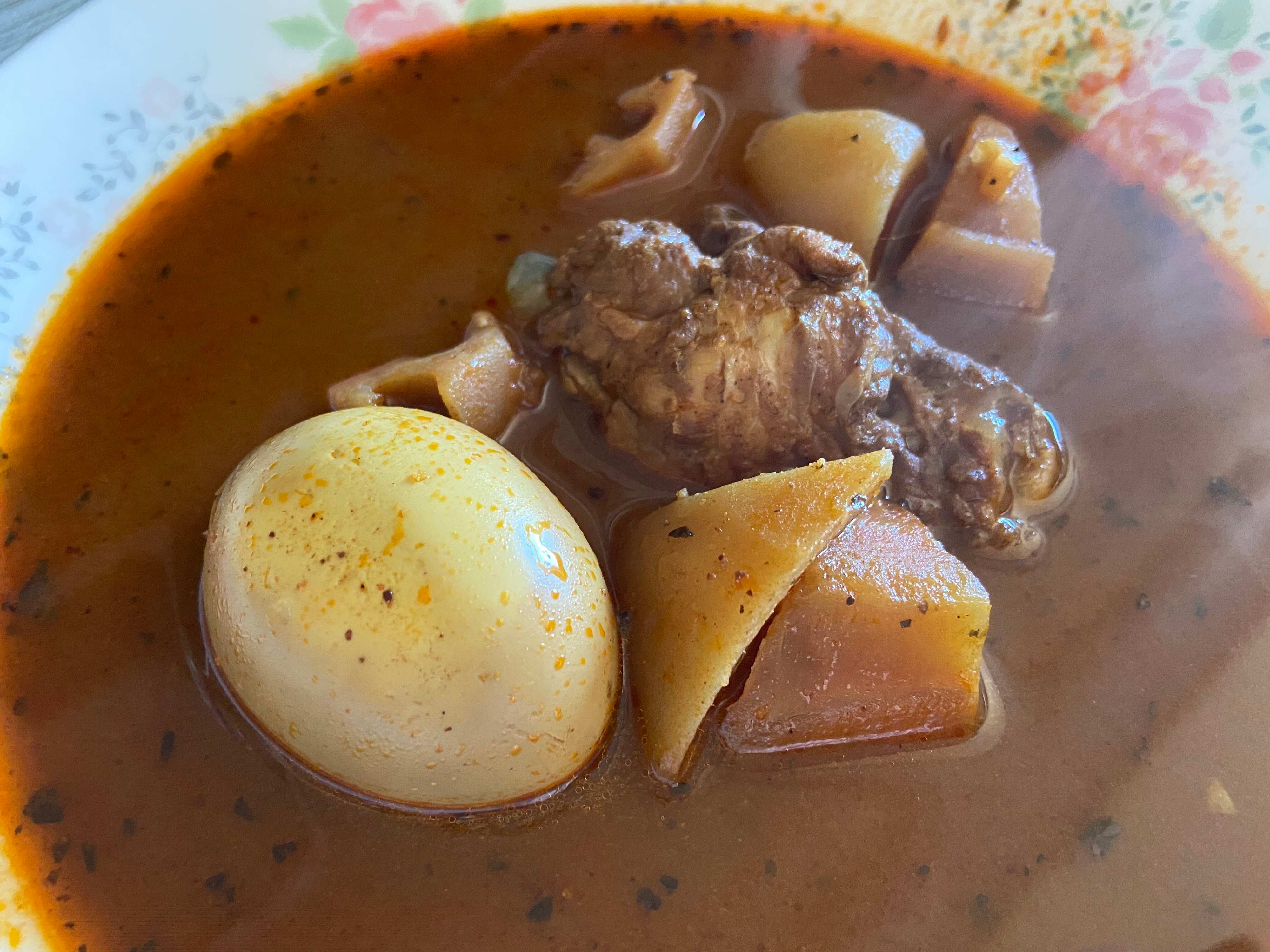 具材はゆで卵、鶏手羽元、じゃがいも、れんこん、にんじん。ゆで卵は丸ごと1個、手羽元も1個ごろりと入って存在感抜群。大き目の一口大の野菜も入って、レトルトとは思えない具材の大きさにまず驚きます。