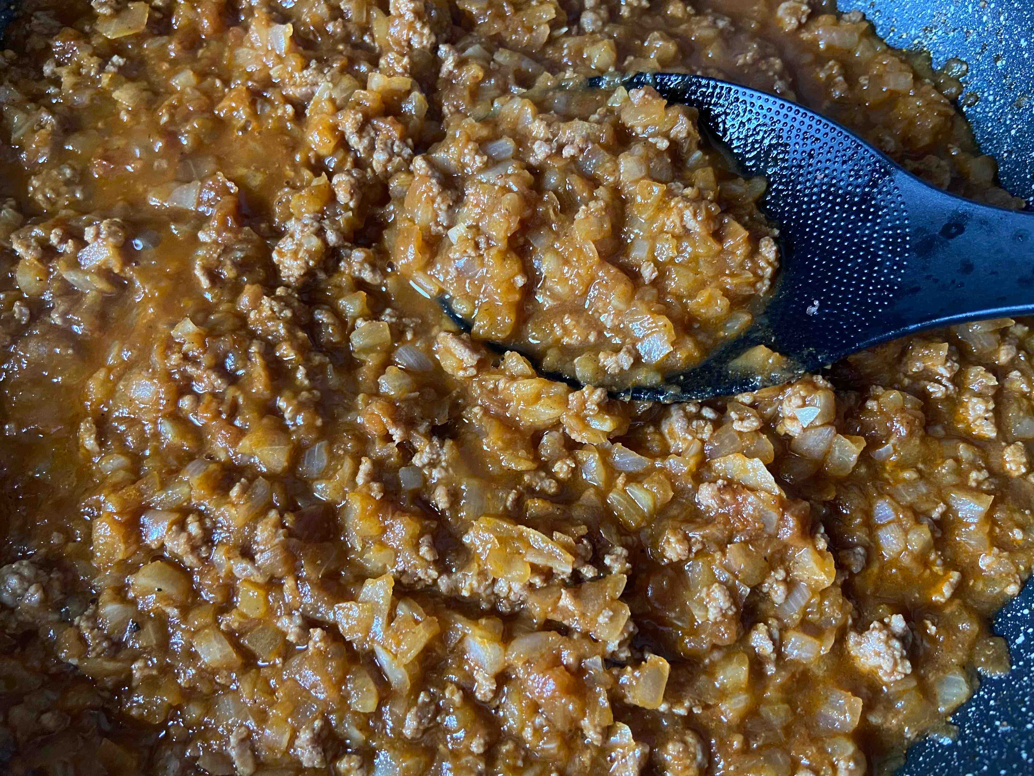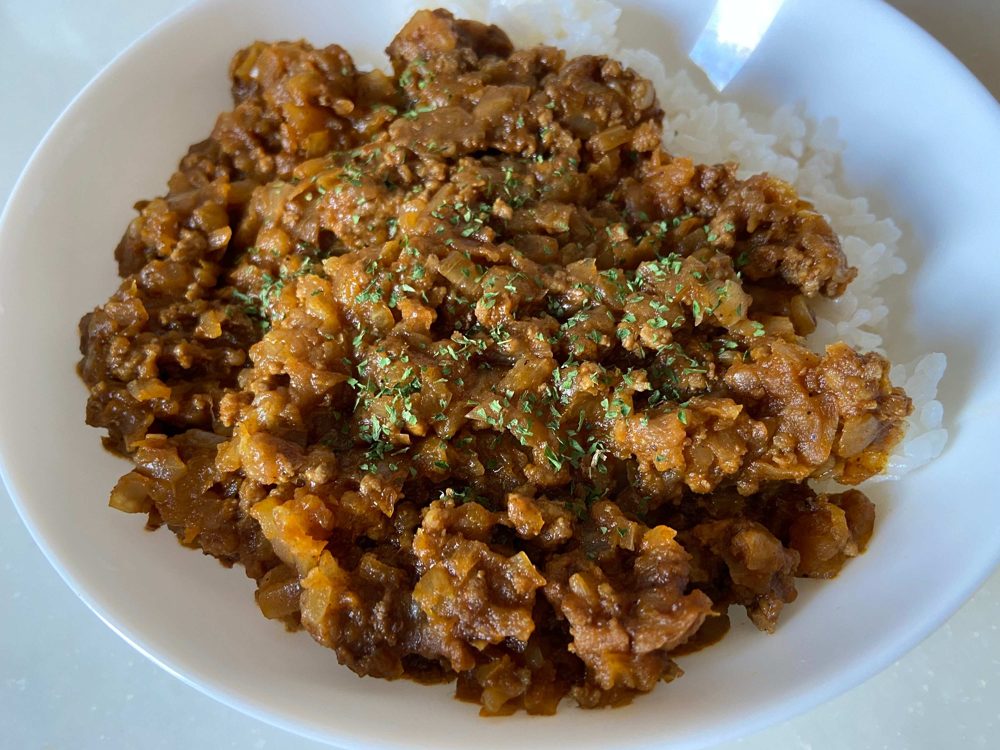 「印度の味」はたっぷりのひき肉と玉ねぎを合わせてキーマカレーに。牛肉や鶏肉など合わせるお肉はお好みで。ややスパイシーですが小学生の子どもでもおいしく食べられる辛さで、子どもから大人まで万人受けしやすそうなコクのあるおいしいカレーです。