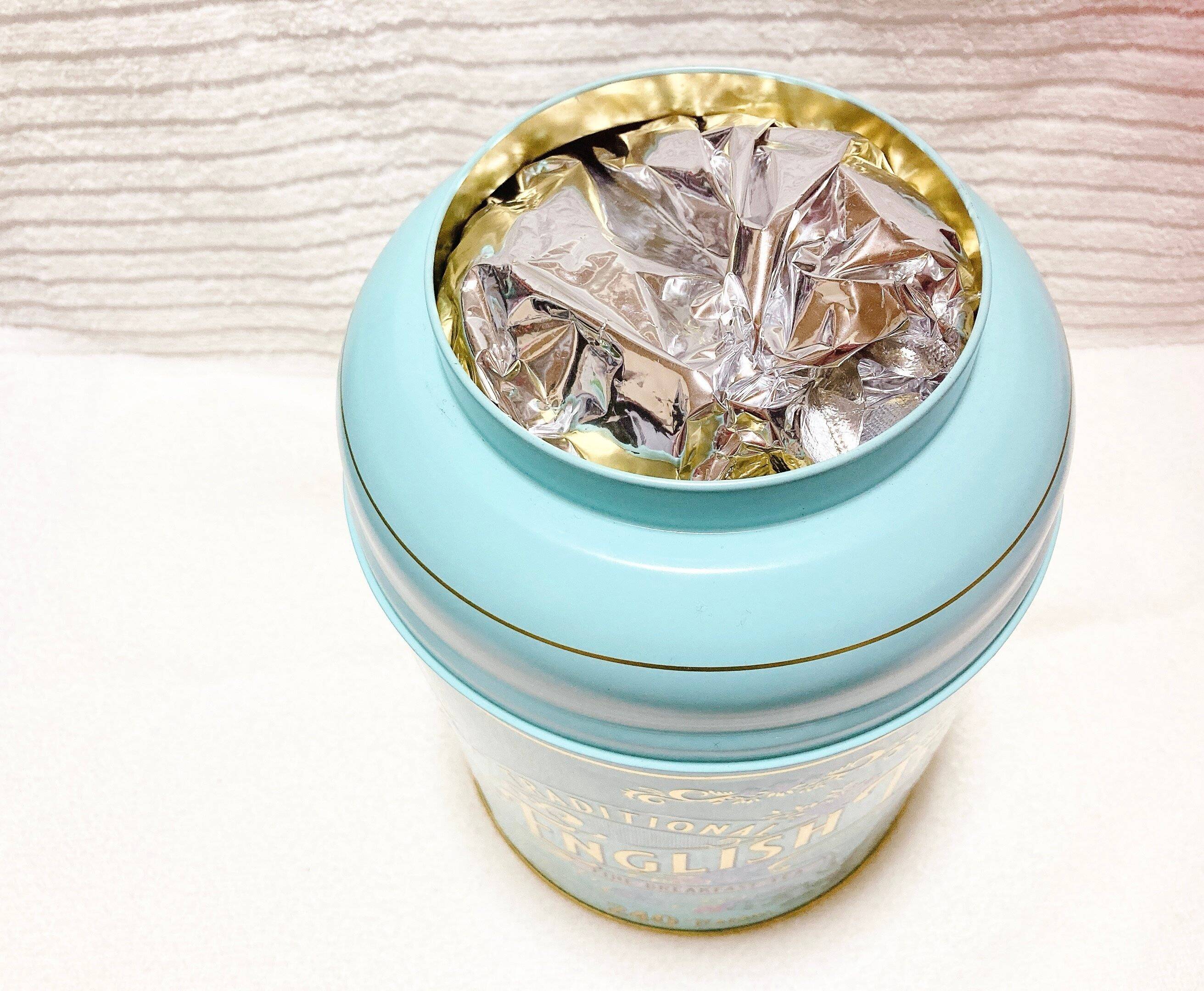 トラディショナルイングリッシュティーの保存方法は、缶に入れる…と、いいたい所ですが銀色の袋をすべて取り出したら全部戻せなくなってしまいました。なので、開封したティーバッグはジッパー付きの袋に入れ保存しています。残り入る分だけをトラディショナル イングリッシュティーの缶で保存しました。