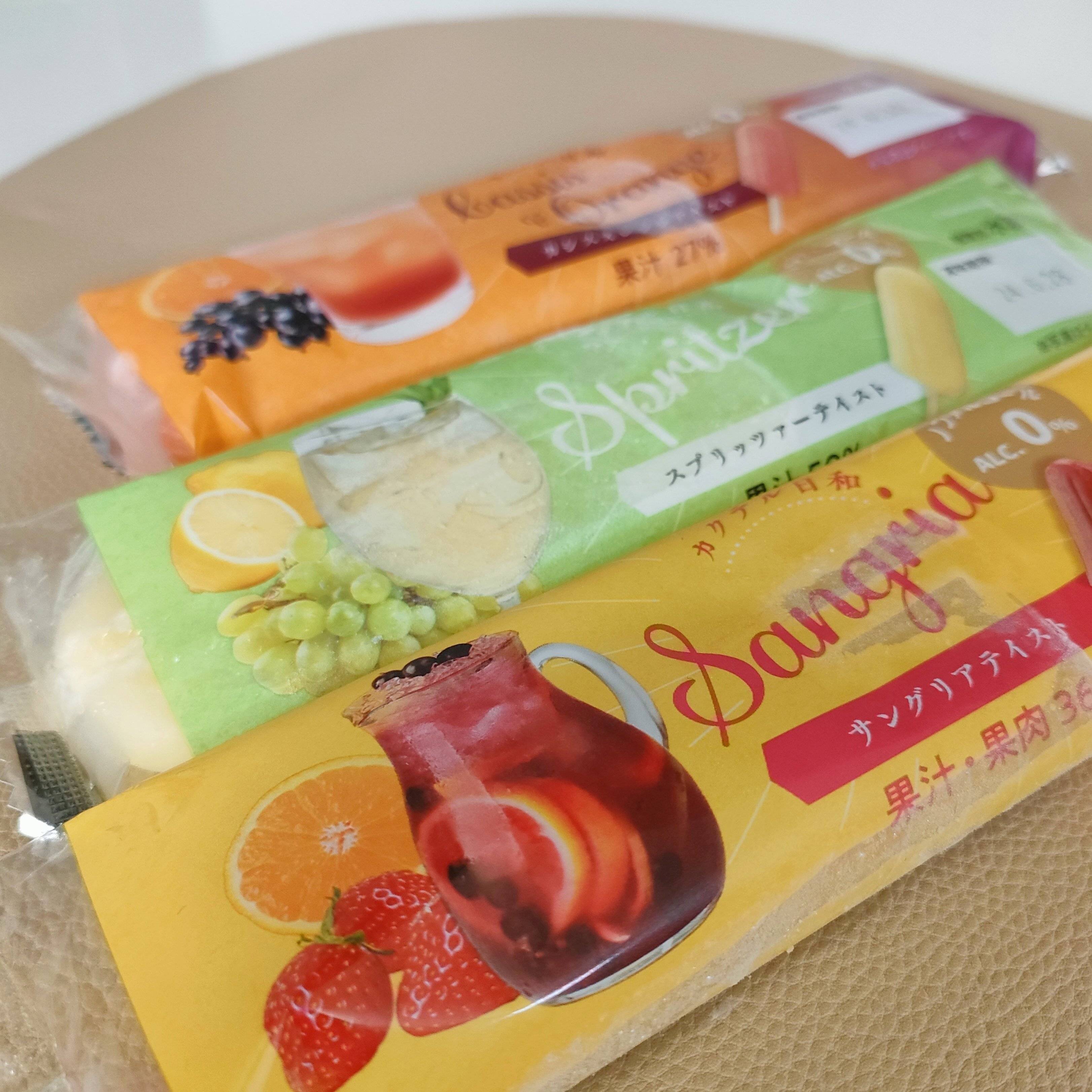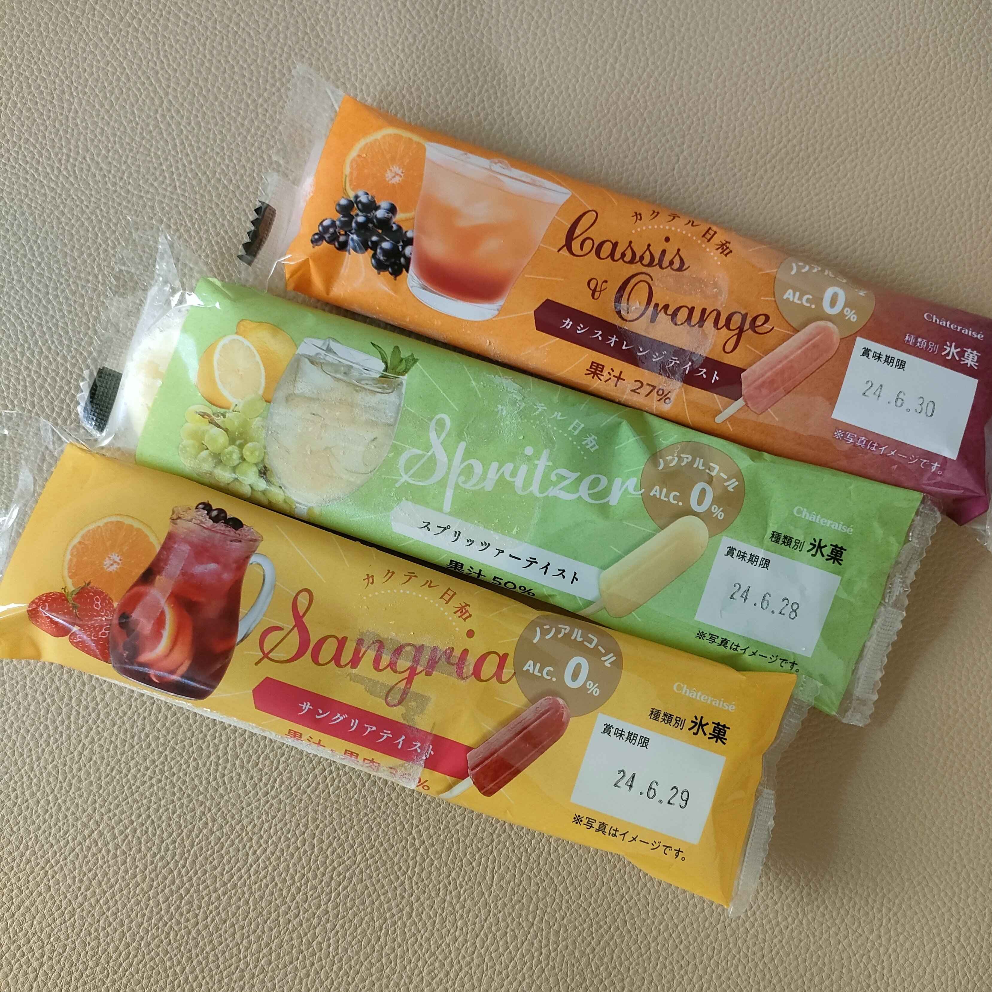 カクテル日和という名前ですが、ノンアルコールで作られている大人向けのアイスです。味はスプリッツァーテイスト、サングリアテイスト、カシスオレンジテイストの3種類。