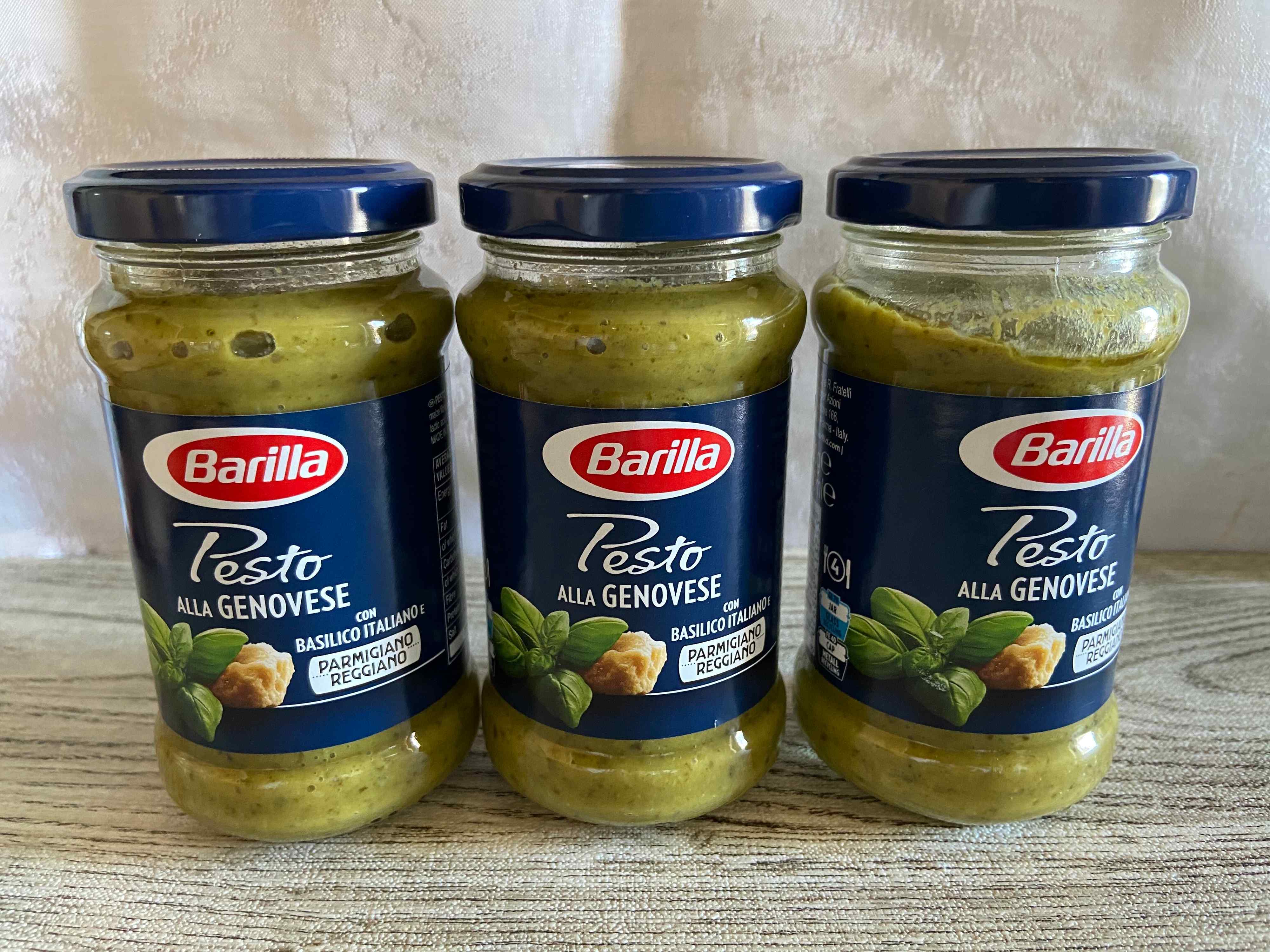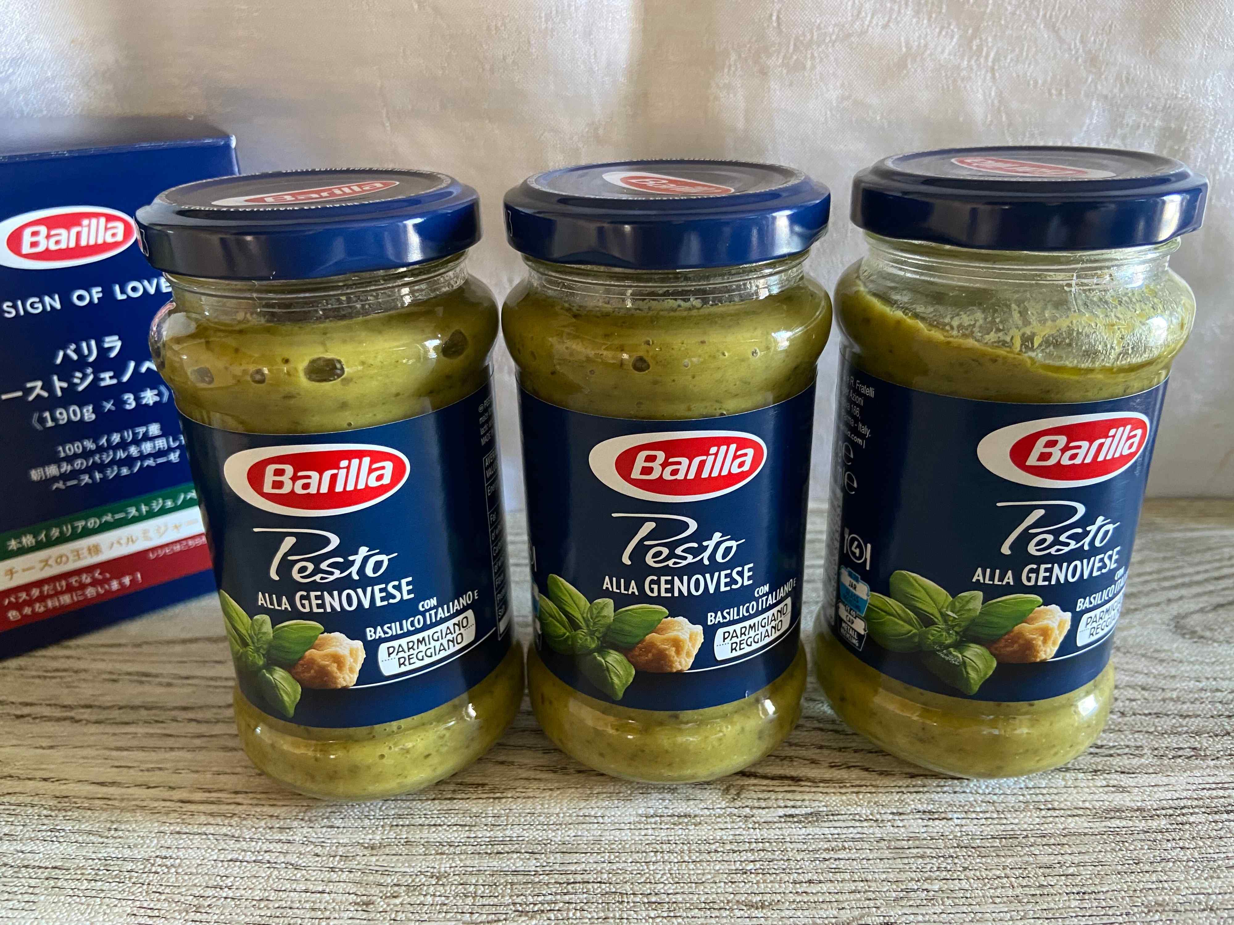 コストコのバリラペーストジェノベーゼは、箱入り商品ですが開封すると瓶が3本入っています。1本は190g入り、一般家庭でも無理なく使い切れるサイズ感がうれしいですね。瓶入りのソース類は一度開封すると冷蔵庫に保管していても悪くなりやすく早く消費しないと、と焦ってしまいますがこのサイズなら「使い切れない!」という心配もありません。