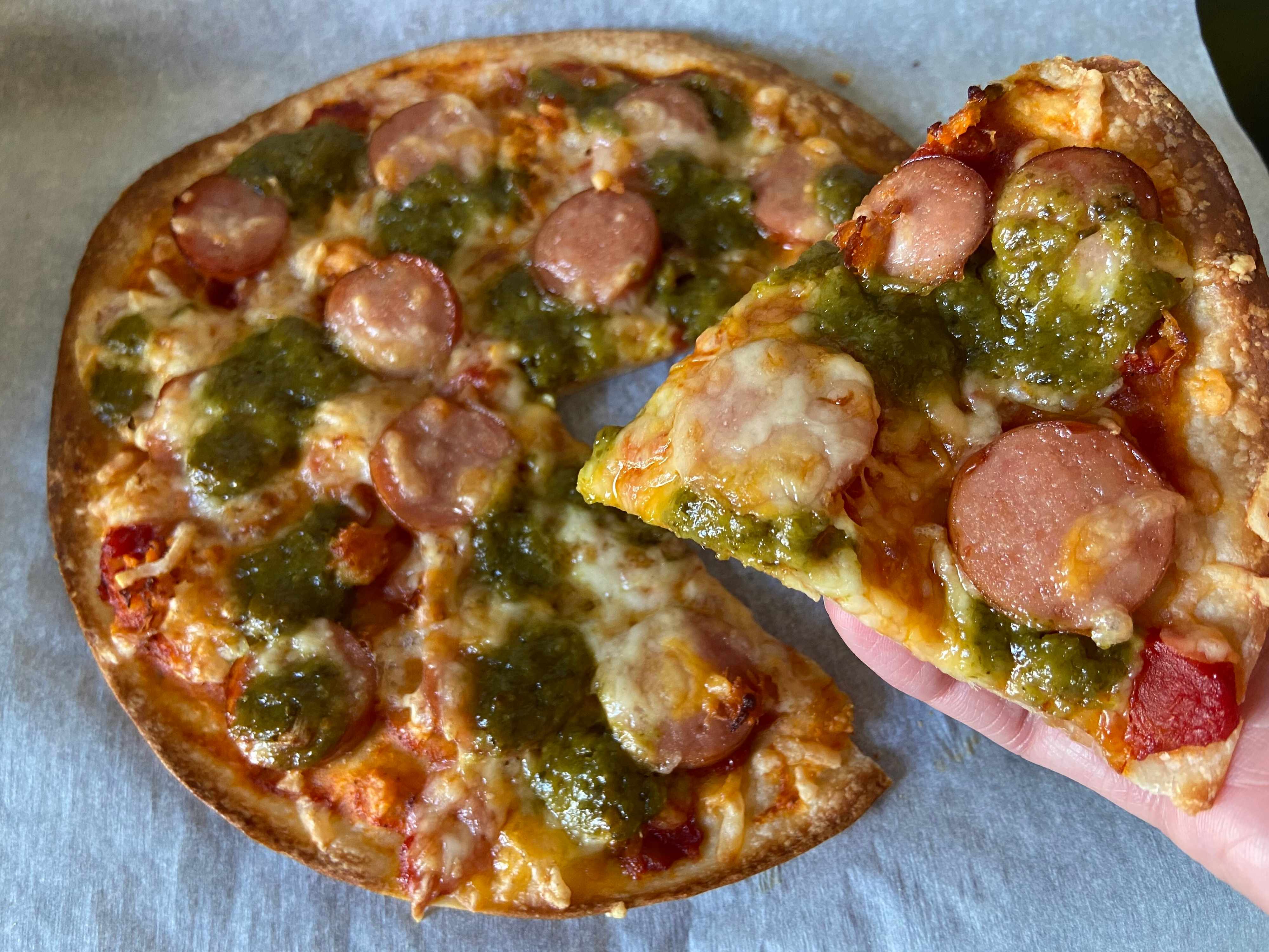 筆者の子どもたちが大好きなピザもよく作ります。ピザ生地にピザソース、もしくはケチャップを塗ってチーズやウインナーなど好きな具材をまんべんなくトッピングし、仕上げにペーストジェノベーゼものせてオーブンで焼けば完成!