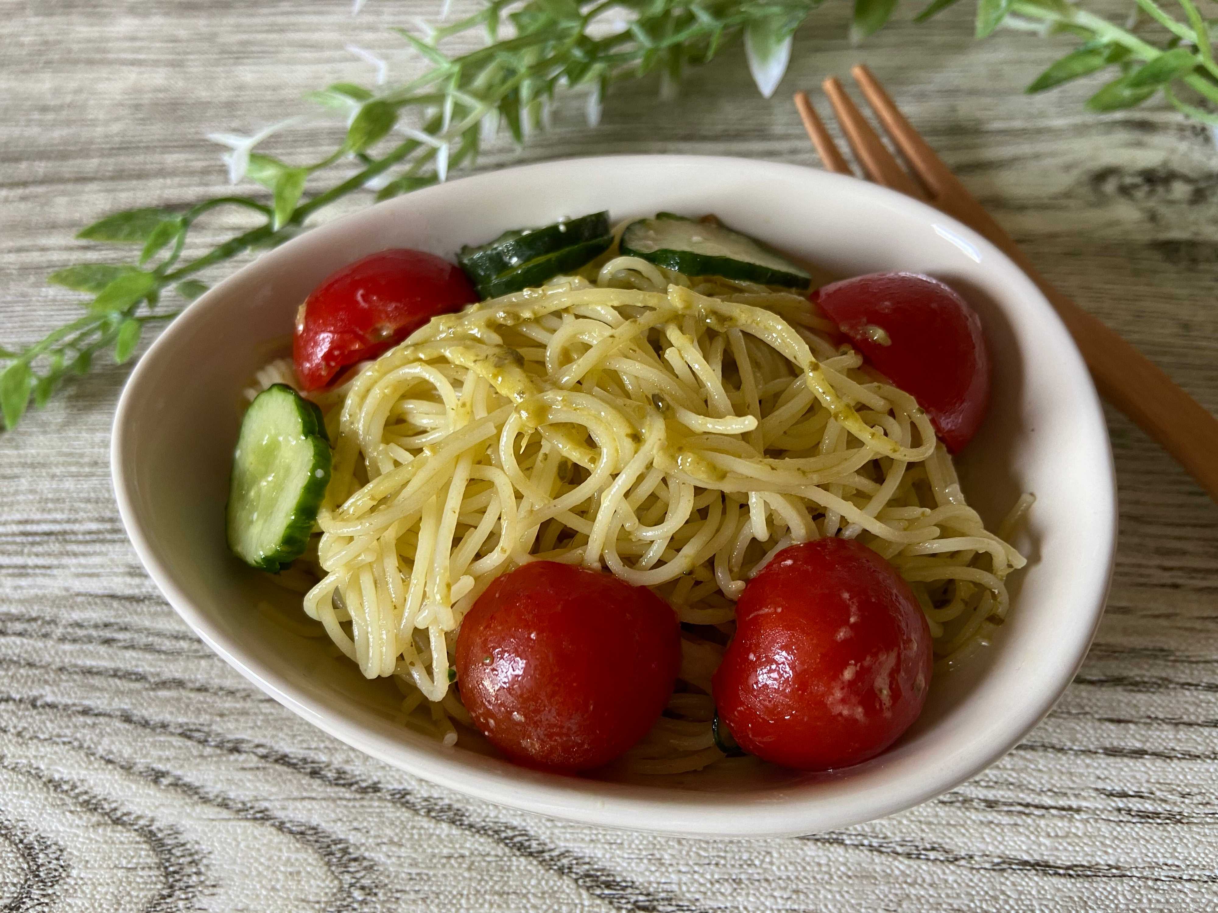 細いパスタ、カッペリーニを使用してジェノベーゼのパスタサラダ風にしてもおしゃれにおいしく楽しめます。加熱して使うことが多いペーストジェノベーゼですが、加熱せずそのまま使うこともできます。パスタサラダなどのサラダや、クラッカーに塗って食べることもでき、アレンジの幅が広がりますね。