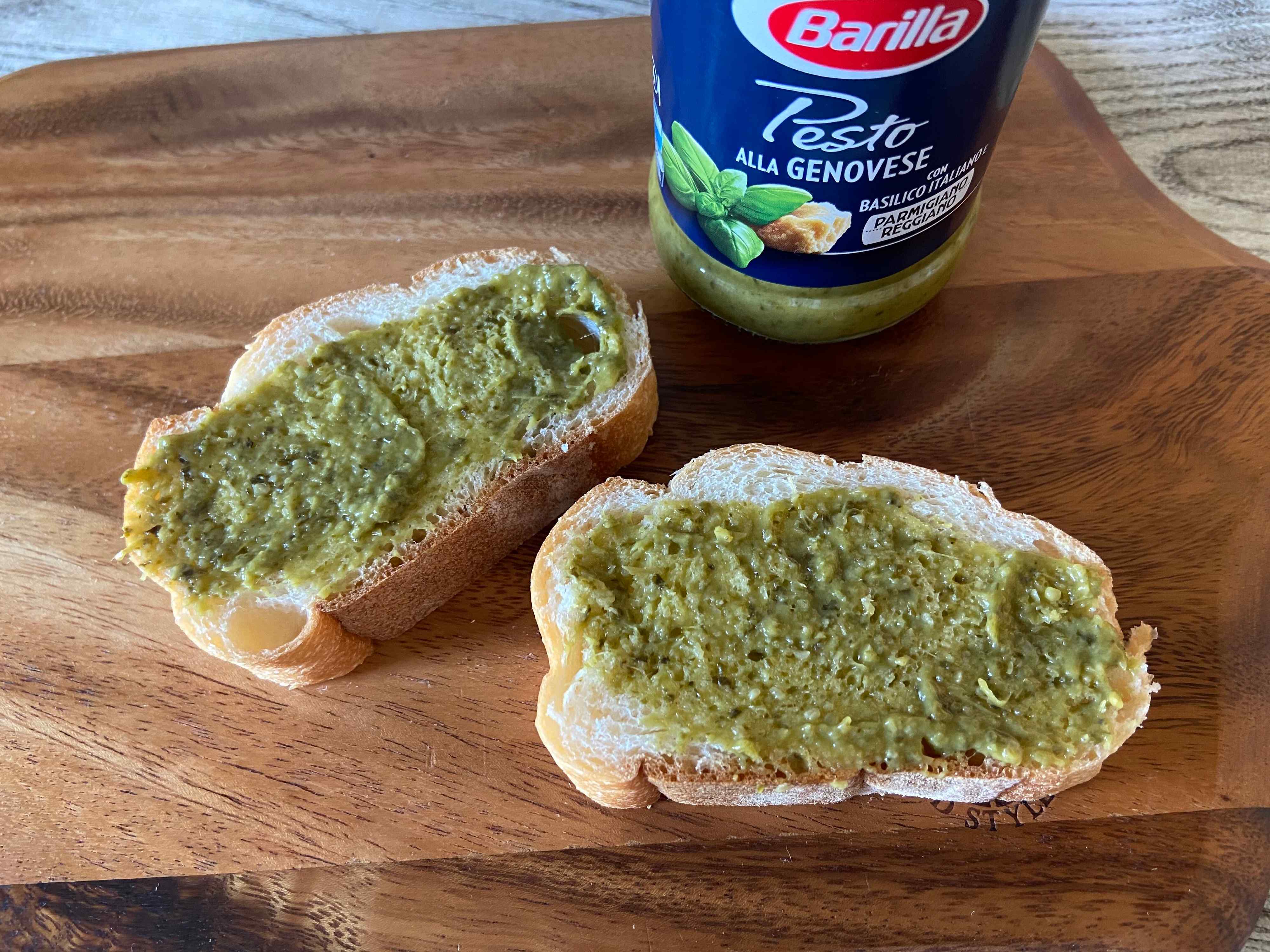ペーストジェノベーゼは、パンとの相性も抜群。食パンやバゲットをトースターで軽く焼いてからジェノベーゼをひと塗り。これだけでとってもおいしい一品が完成です。朝食はもちろん、ワインのおともとしても楽しめます。上にチーズをのせて焼くとピザ風にもなり、いろいろな味わいを楽しめるのもうれしいですね。