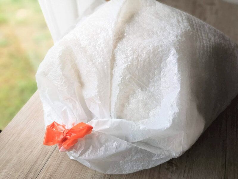 前述のとおり一般的な45Lのゴミ袋よりも小さめなサイズ感ですが、伸縮性もあり、口を紐でぎゅっと寄せることができるので、思いの外たくさん詰めることができます。
