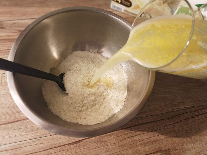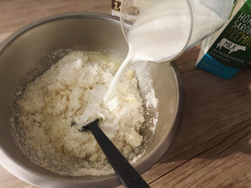 全体的にさっくり混ぜたら、牛乳240mlも加えて更に混ぜます。