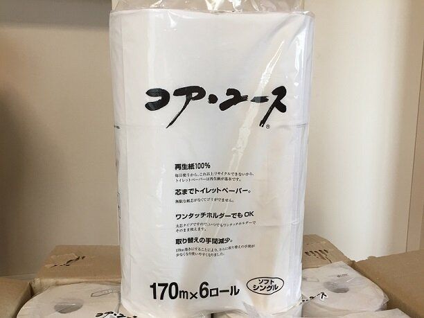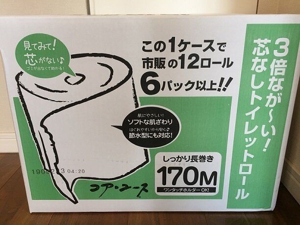 コア・ユースは6ロール×4パックの計24ロール入りで、とても巻きが長いのが特徴です。一般的なトイレットペーパーは50mなのに対し、コアユースはなんと170m!3倍以上の長さがあるので一度ホルダーにセットすればしばらく交換せずに済み、長持ちするのでトイレットペーパーを買いに行く手間もぐっと減らすことができます。