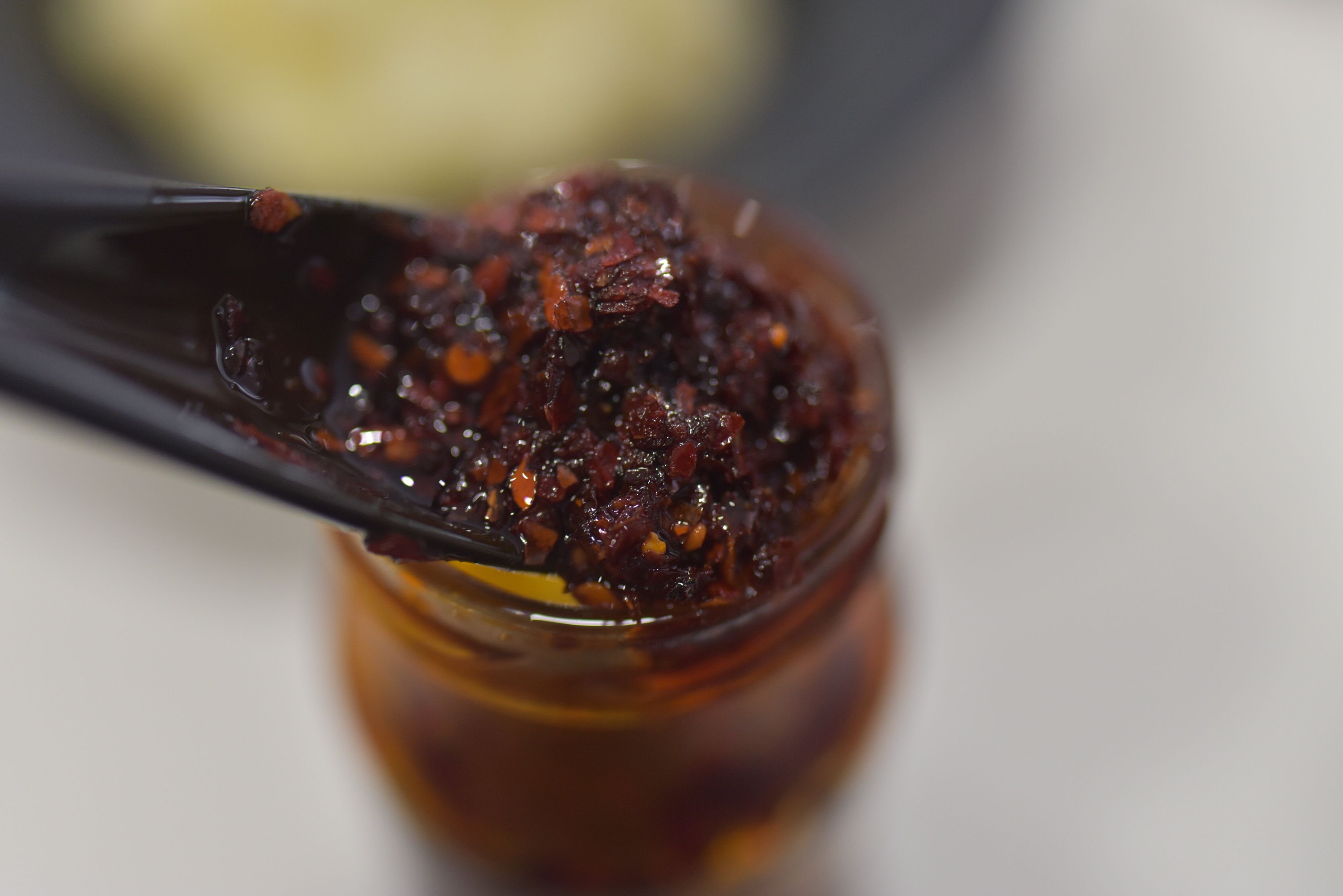 瓶の中身は、粗刻みな唐辛子やゴマ、山椒がぎっしりと詰まっています。マーボー豆腐などの中国料理や、餃子の漬けダレとして使うのがおすすめです。