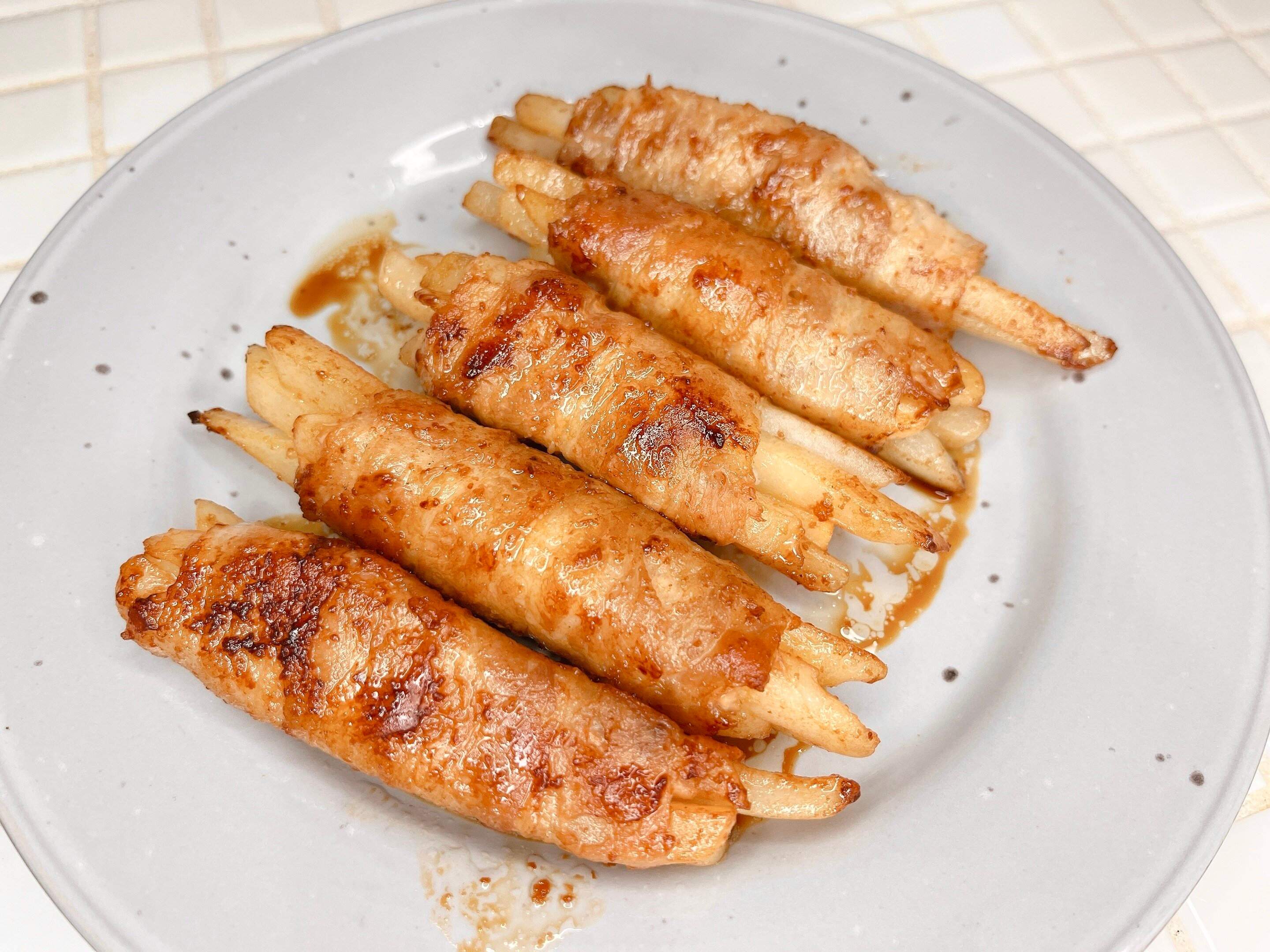 フライドポテトを薄切りの豚バラ肉で巻いてよく焼いて、仕上げに甘辛く煮詰めたタレをかけ、絡めたら出来上がりです。よくあるじゃがいもの肉巻きのアレンジですが、ポテトを巻くだけなので、じゃがいもを切ったりする工程が省けて簡単に調理出来ます。