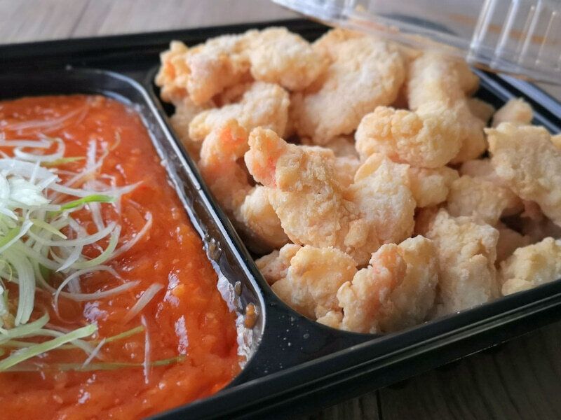 一方にはエビチリソース、もう一方には、調理済みのエビがたっぷりと入っています。