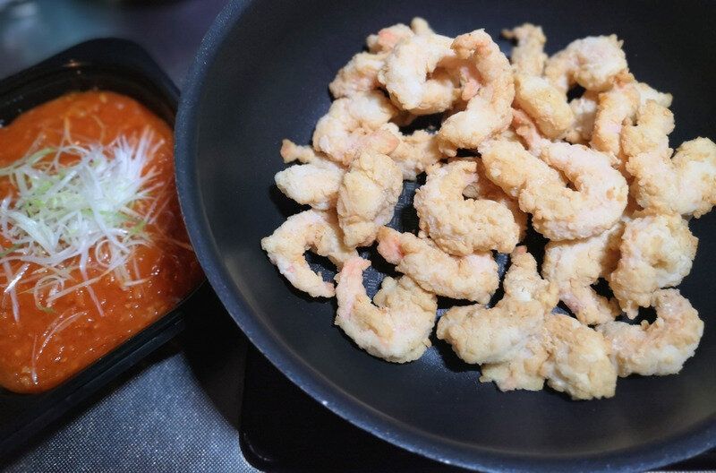 エビは少量の油を引いたフライパンで炒めましたが、もともとが揚げてあるフリッターなので、少し多めの油で炒めたほうが本格的な仕上がりになりました。