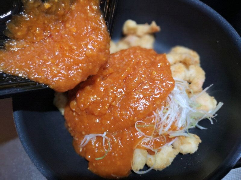 エビチリソースはしっかりしたとろみがついていて、多少振ったぐらいでは飛び出さないぐらいのぽってりとした硬さがあります。