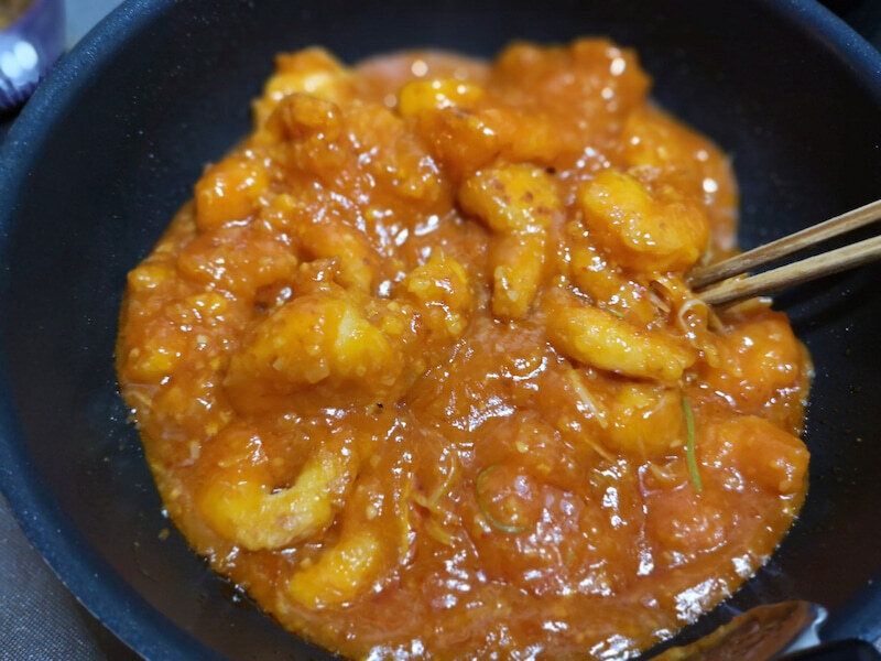 あっという間にできあがったエビのチリソース。