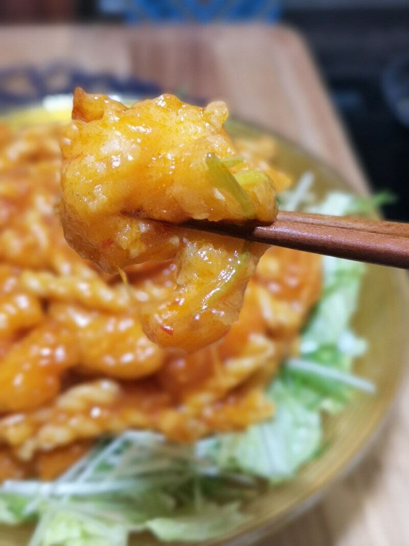 本格的なチリソースで、ピリ辛ですが子どもも食べられるぐらいの絶妙な辛さ加減で、深みのある中華の味つけが、とてもお家では味わえない、