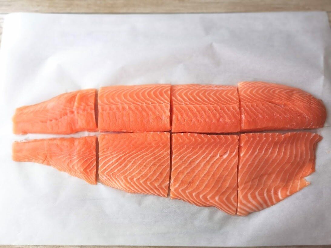 サーモンの切り身を広げると、先になるほど細くなる部分があります。こちらはサーモンの尾に近い部分で、脂ののり方は控えめ。