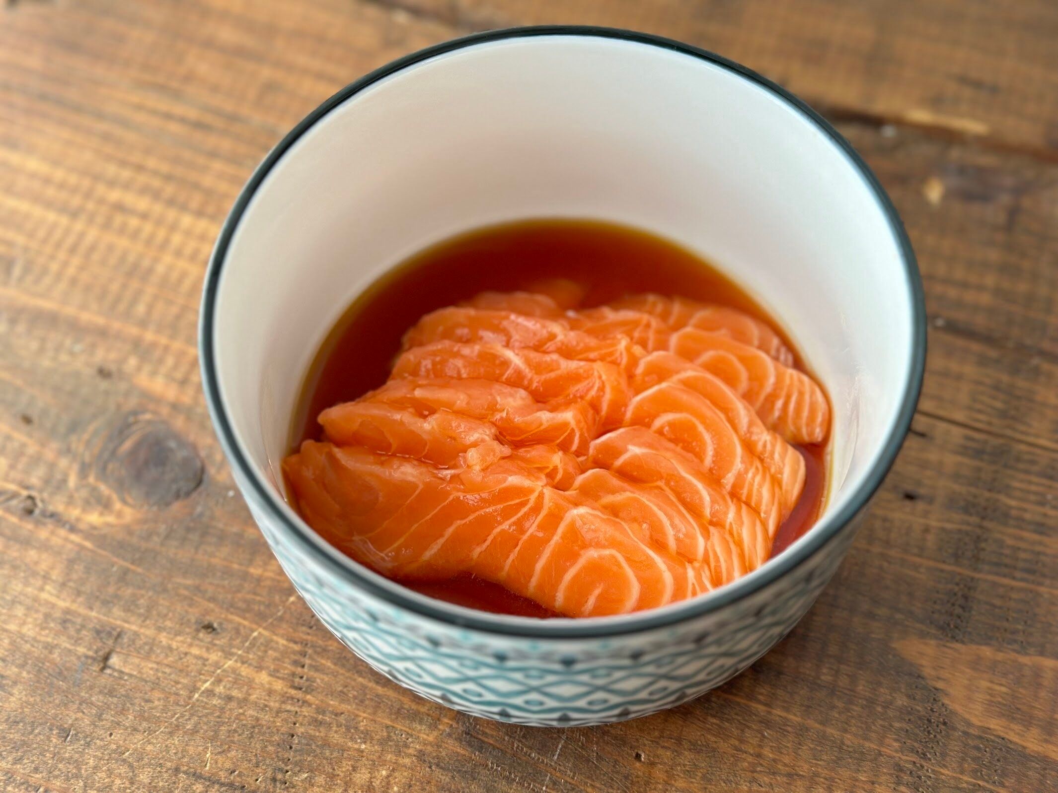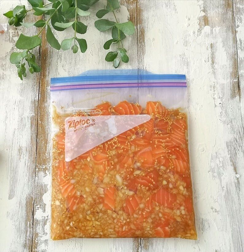 作り方は、醤油2:みりん1:酒1の割合で合わせタレを用意して、一度煮立ててアルコールを飛ばします。タレが冷めたら、サーモンを浸し、20分〜で食べごろです。