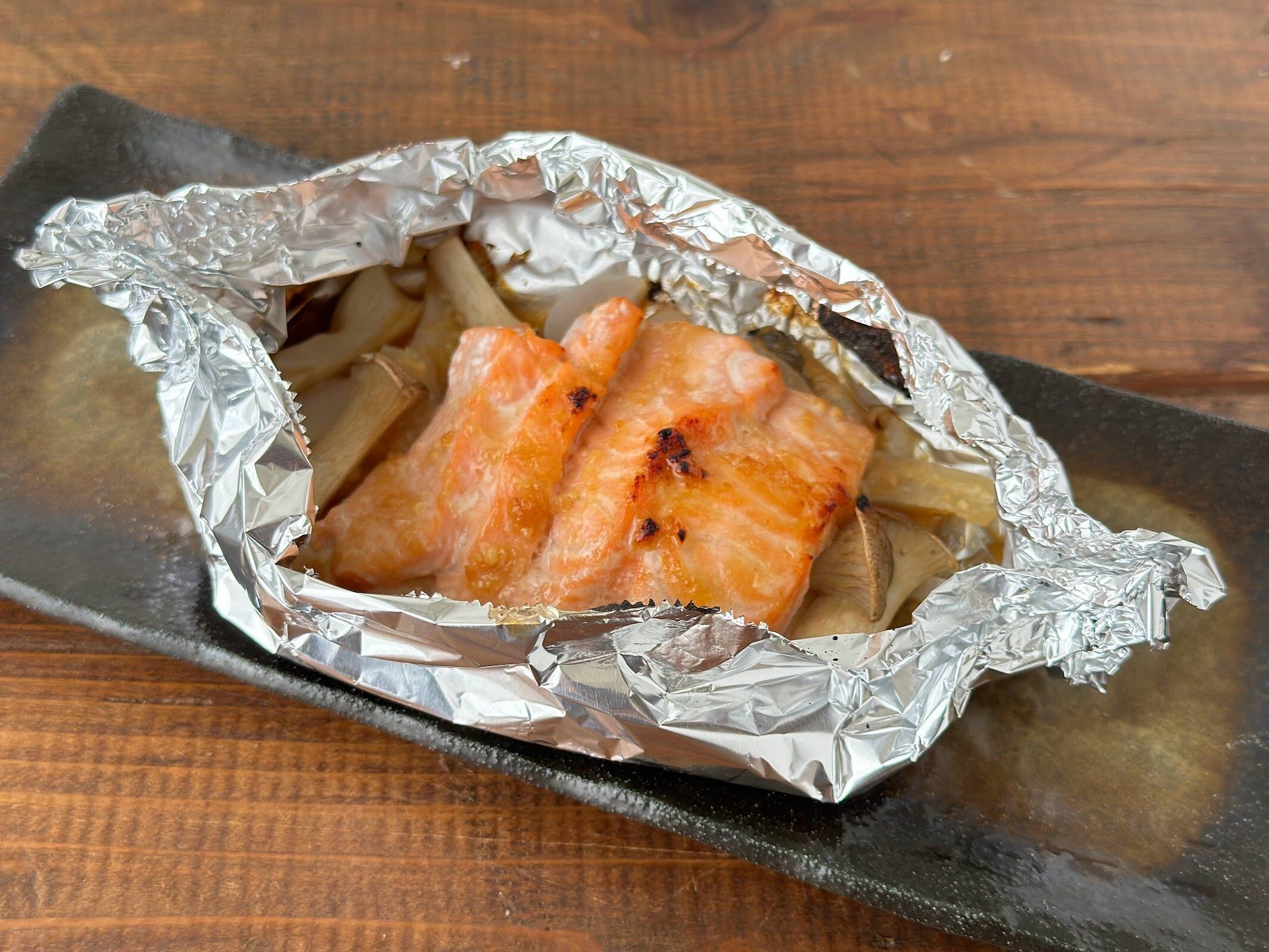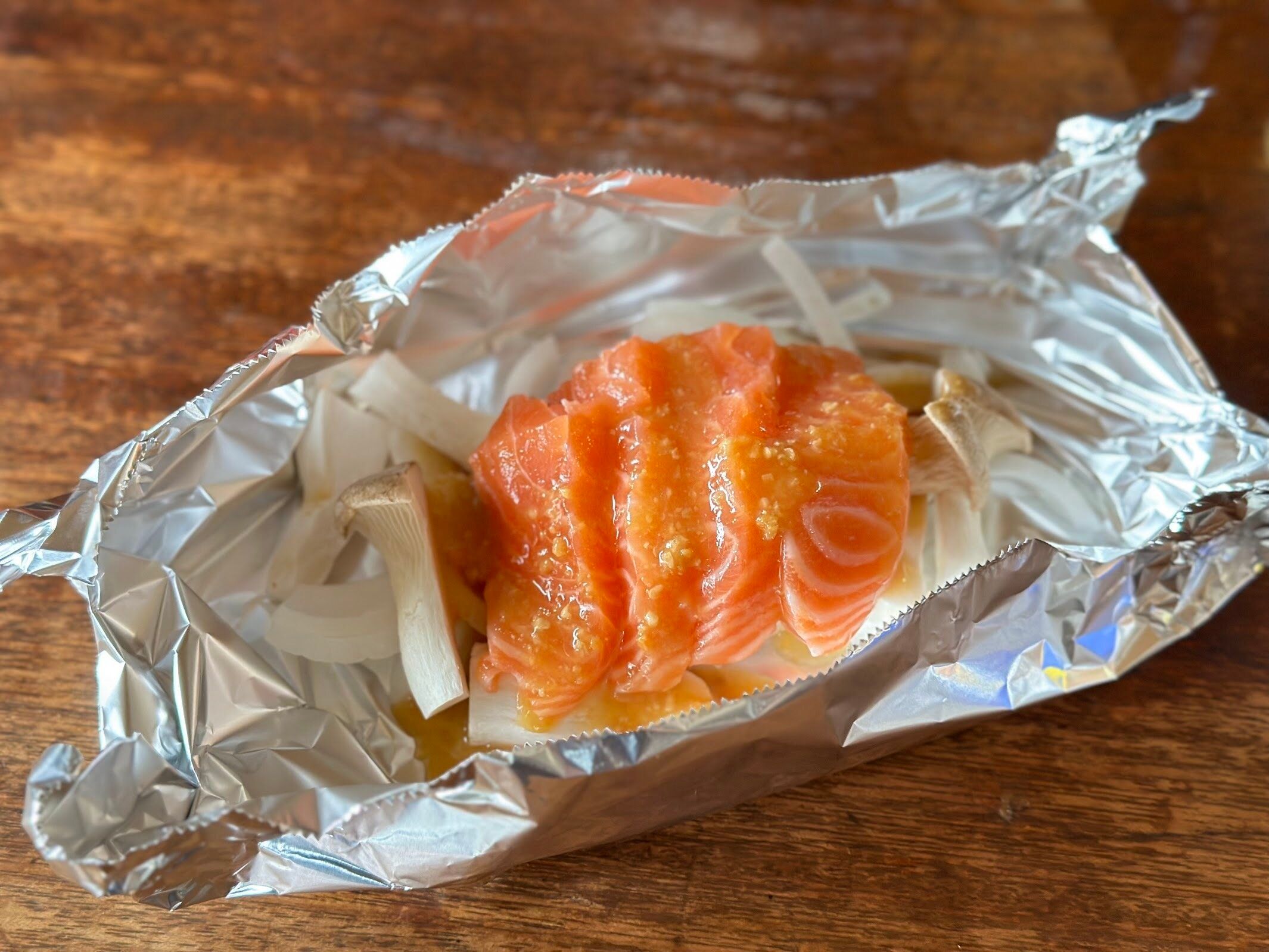 作り方は、玉ねぎやきのこなどお好みの野菜をアルミホイルの上に並べて、その上に、食べやすくカットしたサーモンを載せます。