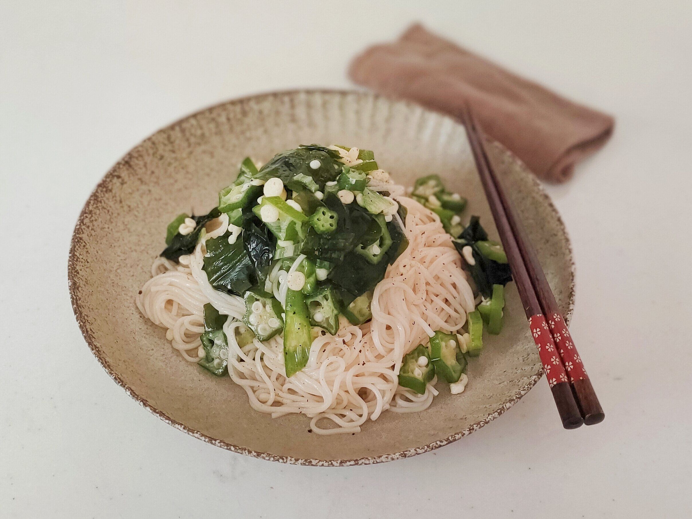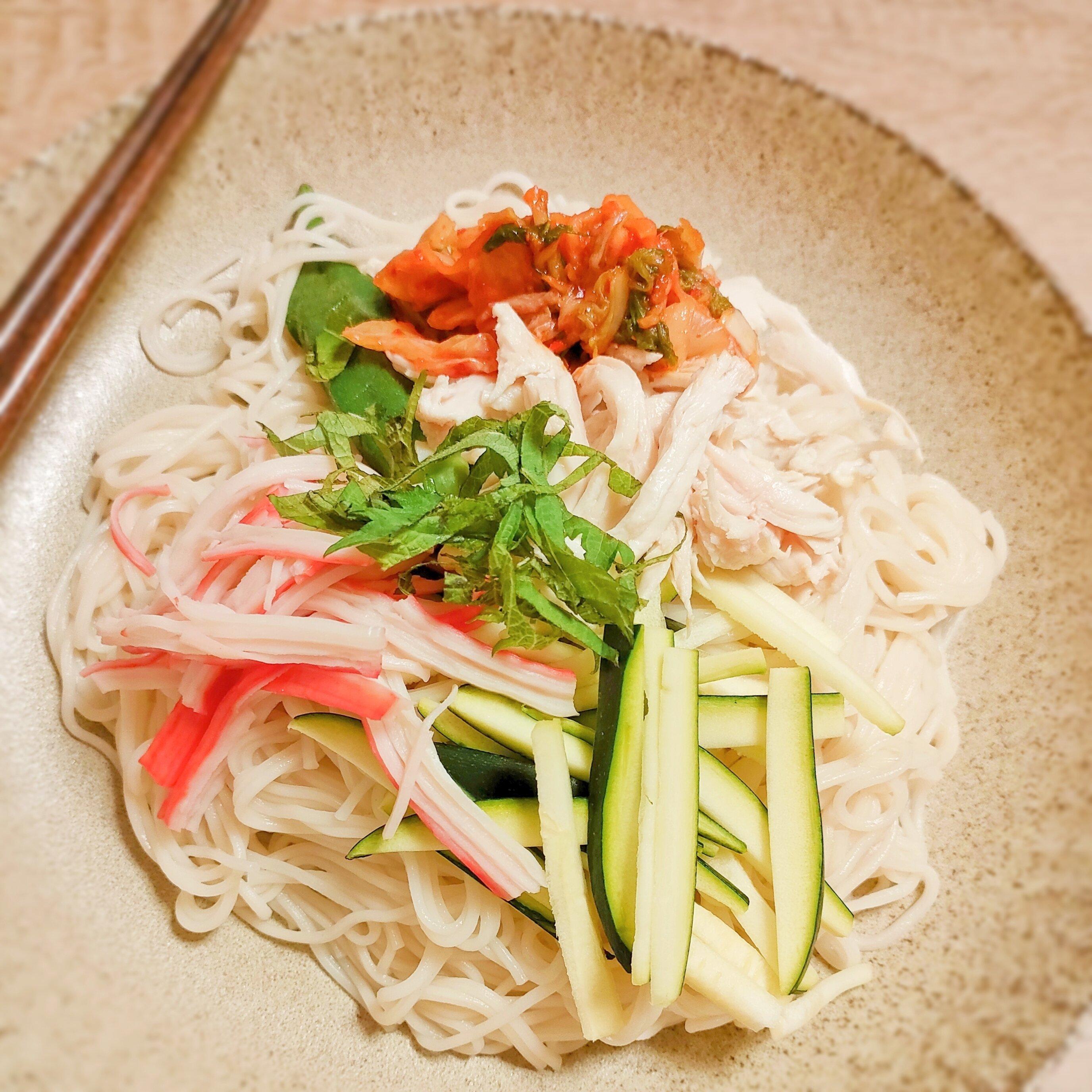 サラダうどんのように、お肉やきゅうり、カニカマなどをたっぷりトッピングすれば、これだけでも立派なごはんになります。