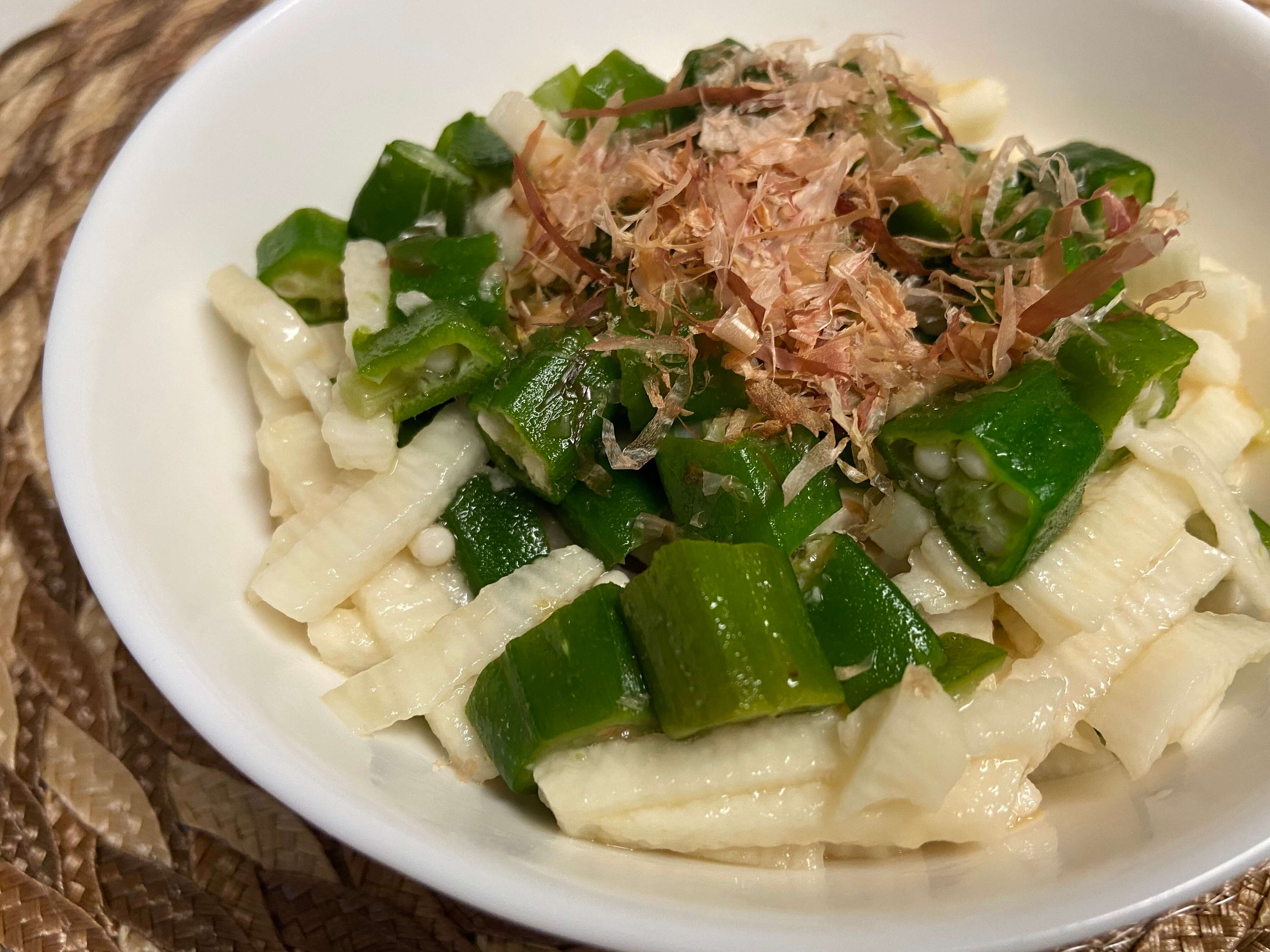 電子レンジで500Wで2分程加熱して、粗熱をとったオクラをカットし、細切りにした長芋と合わせてめんつゆをかけて混ぜました。ねばねば食材の組み合わせでこれから暑くなる季節にもぴったりのおいしさ!