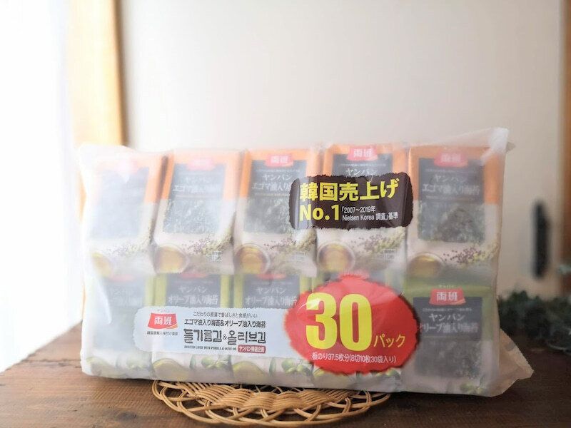 2種類の韓国のりが各15パック入で、合計30パック入っています。