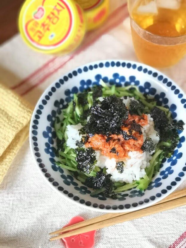 アレンジ方法は、きゅうりの千切り、ごはん、唐辛子ツナをのせたところに、韓国のりをトッピング。