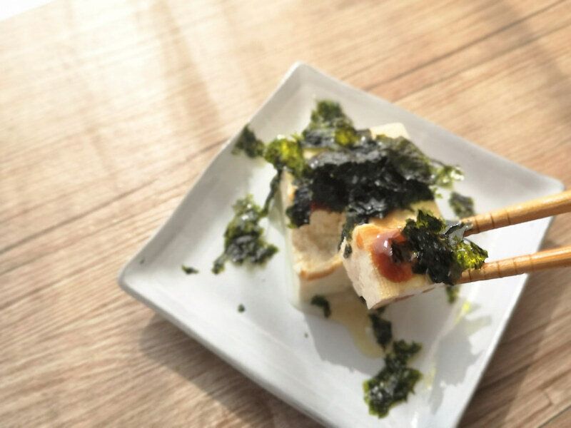 冷奴にかけて、韓国のりをパラパラっとトッピングし、お好みで追いごま油で仕上げれば、韓国風冷奴のできあがりです。