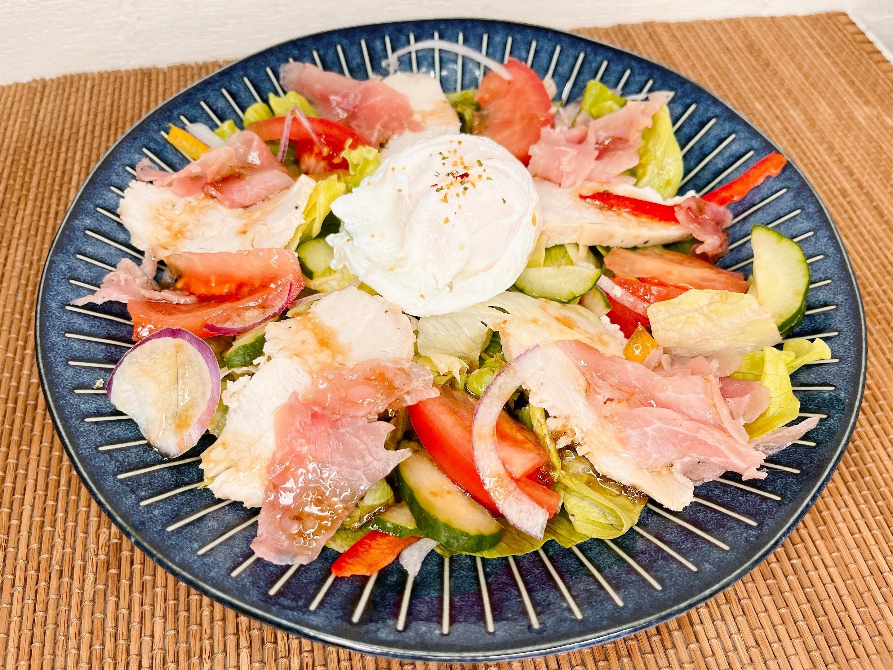 ポーチドエッグをのせた、朝食やランチにぴったりな具沢山サラダをご紹介します。