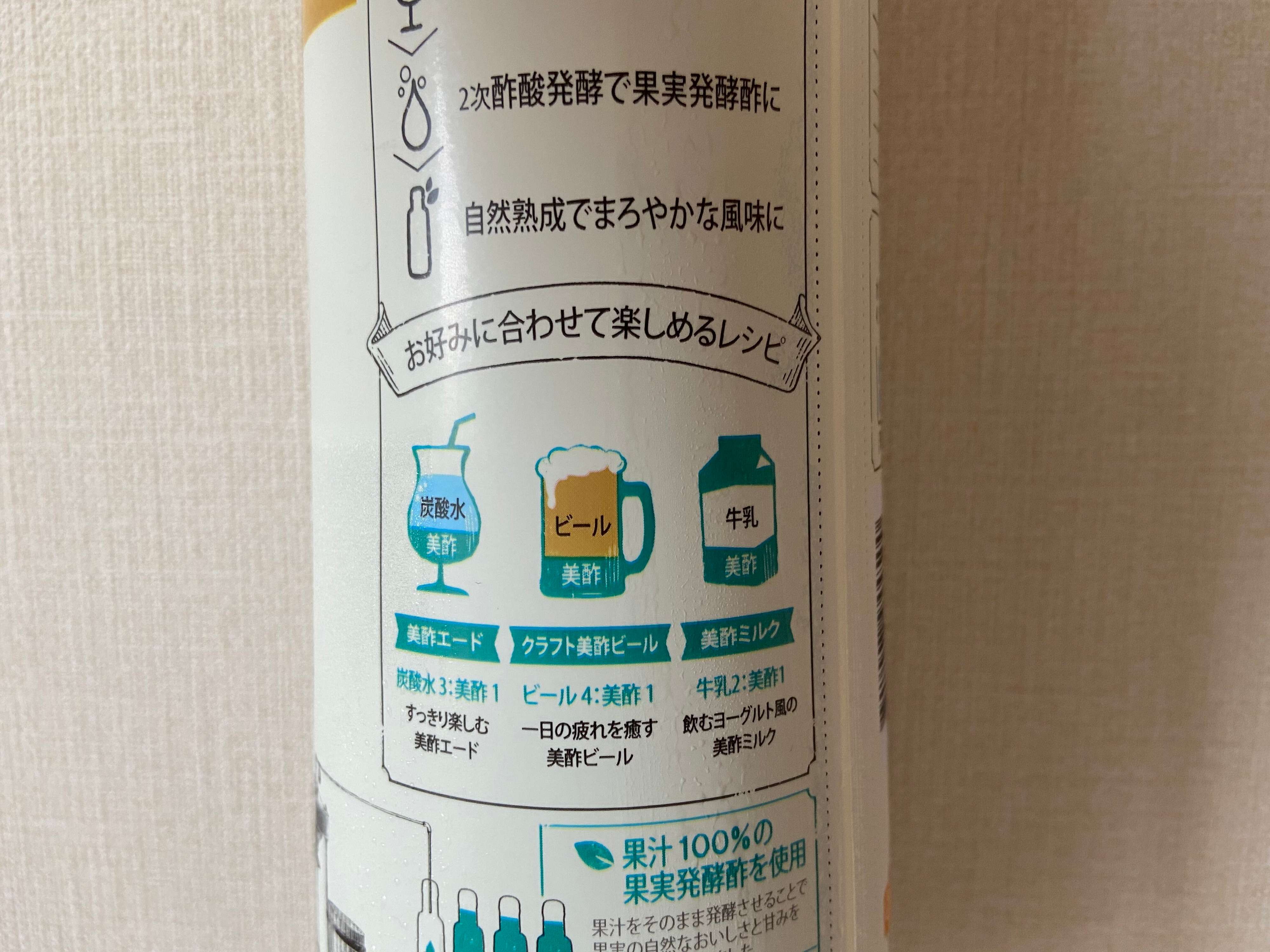ボトルにも3種類のレシピが掲載されています。炭酸水3:美酢1で割った美酢エードはフルーティーでまろやかな酸味にシュワシュワの炭酸が心地よく、すっきりとしたおいしさ。ビール4:美酢1で作ったクラフト美酢ビールは疲れも吹き飛ぶ爽やかな一杯。牛乳2:美酢1で割った美酢ミルクは、飲むヨーグルト風のとろみと濃厚な味わいが魅力。筆者は美酢ミルクで飲むのが一番のお気に入りで毎朝の定番の一杯になっています。