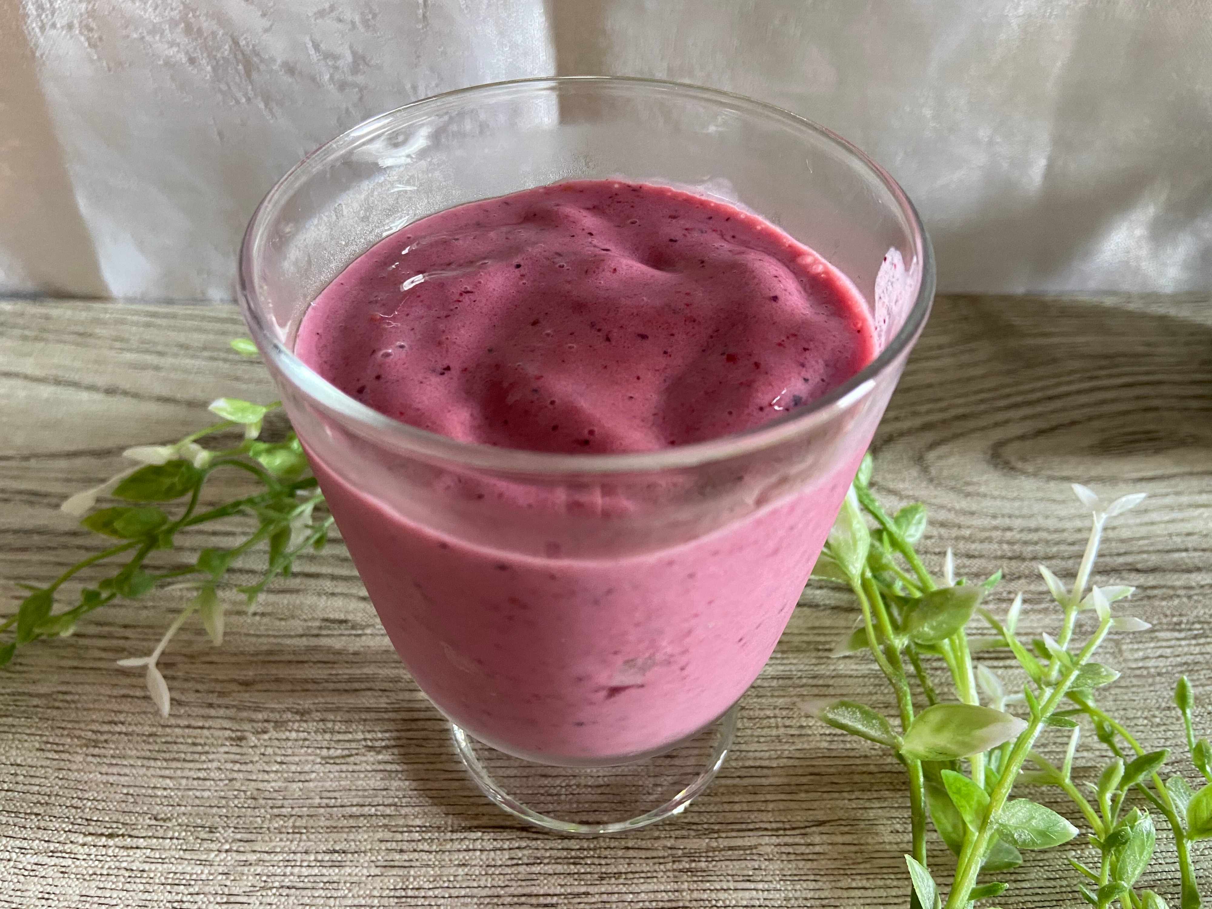 美酢スムージー1杯分の材料は、美酢いちご45ml、豆乳60ml、冷凍ミックスベリー30g、氷70gです。まろやかな酸味と甘さにシャリシャリッとしたひんやり食感がプラスされ、とてもおいしい!美酢や、冷凍フルーツはお好みのものに変えて作ることもできるのでいろいろな組み合わせを楽しむこともできますよ。