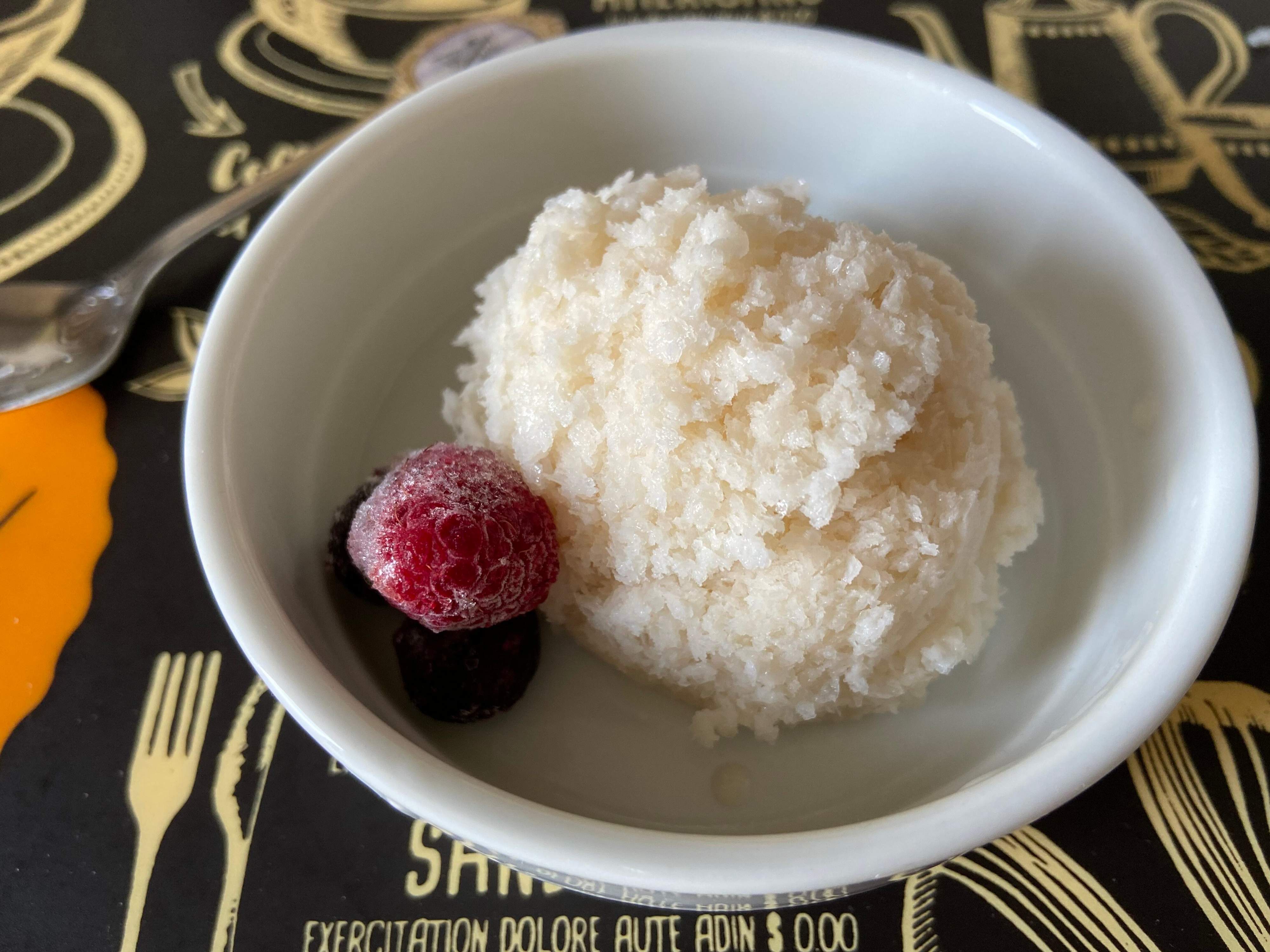 こちらも調理はとっても簡単。保存容器かチャック付の保存袋に、美酢パイナップル30ml、牛乳40ml、水20mlを入れて冷凍庫で冷やし固めるだけ。数時間後に、保存容器の場合はスプーンで全体をかき混ぜ、保存袋の場合は袋の上からよくもみこみ空気を入れて、さらに数時間冷やして完成です。