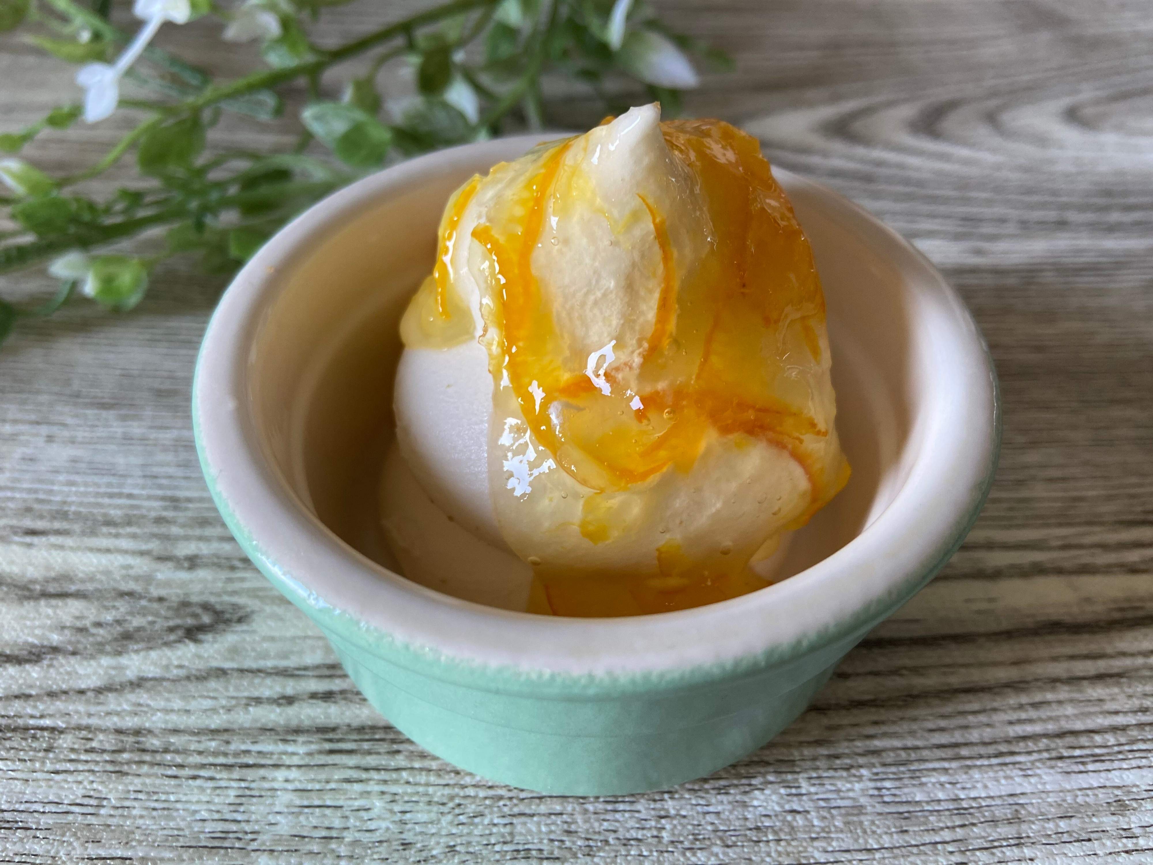 こちらは市販のソフトクリームを使用。1つ当たり、美酢レモンを8ml、マーマレードジャムを36gよく混ぜて、ソフトクリームの上にたっぷりかけるだけ。見た目も華やかでおしゃれな一品が簡単に完成しました。ソフトクリームのミルキーなコクにマーマレードの甘さとほろ苦さ、美酢の甘酸っぱさも絶妙にミックスされて食後のデザートとしてもぴったりです。
