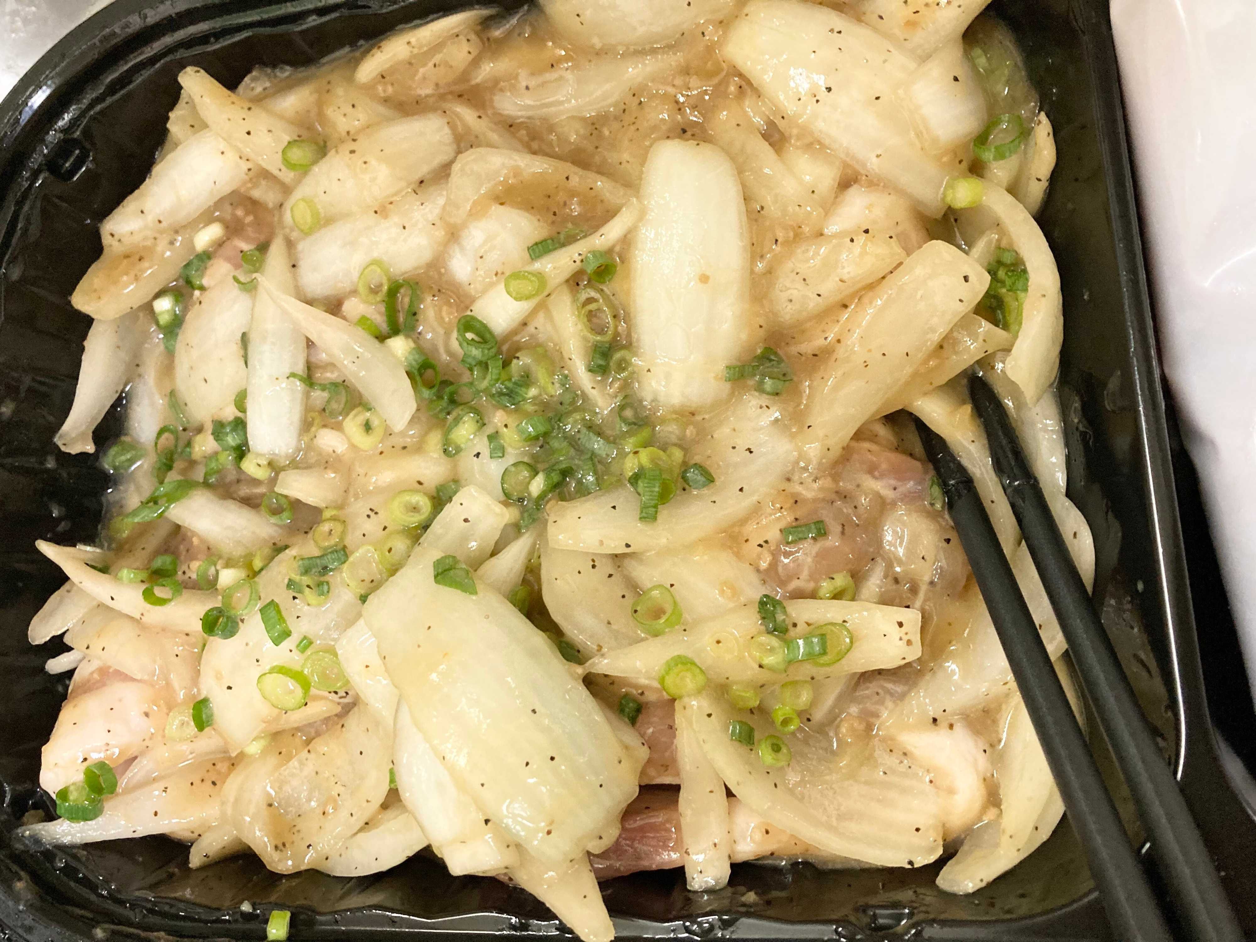 仕切り付きの容器には、お肉の他に、ゴロゴロとした大きめにカットされた玉ねぎ、トッピングの青ネギ、袋に入ったサムジャンが入っていました。