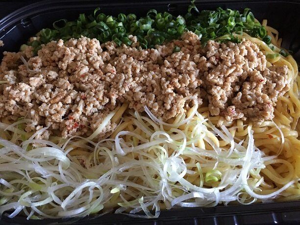 フタを開けると麺の上に味付きのひき肉、白髪ネギ、青ネギがたっぷりとのっています。別添えで個包装の殻付き半熟卵が2個とカップに入ったまぜそばソースが。