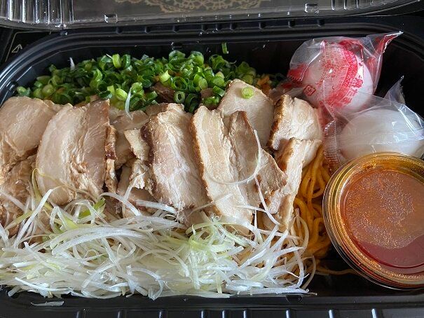 つづいて登場したのが「麻辣まぜそば」(購入時:1180円税込)。台湾風まぜそばキットにつづき第2弾も辛口テイストなまぜそばで、店頭に並び始めた頃はとても話題になった商品です。麺が見えないほどたっぷりのった焼豚とネギ、ボリュームがありインパクト大で売り場でも存在感がありました。