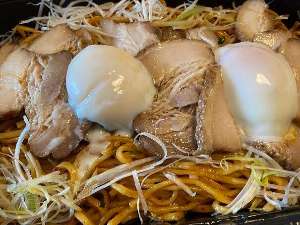 フタを開けると、焼豚の香ばしいいい香りが食欲をそそります。たっぷりの具材の隙間からのぞく麺が赤く味付けされていて辛そうな見た目!