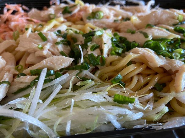 内容量は台湾風まぜそばキット、麻辣まぜそばと同様1kg超えの1070g、100g当たり165kcalです。主な原材料は中華めん、蒸し鶏、まぜそばソース、釜揚げ桜えび、釜揚げ白えび、長ネギ、青ネギです。
